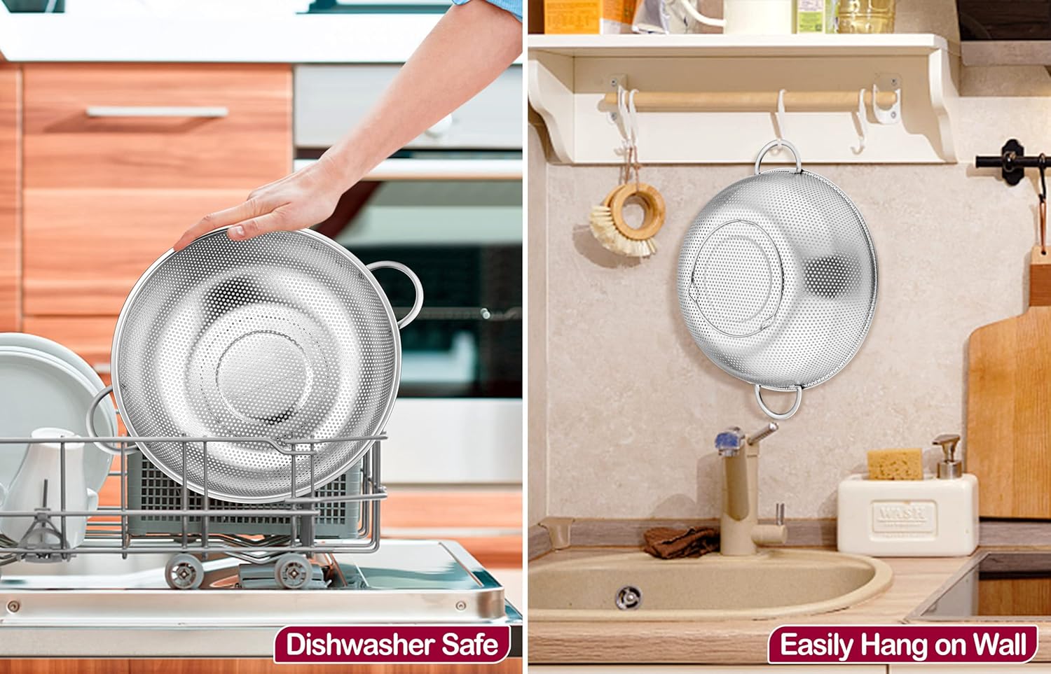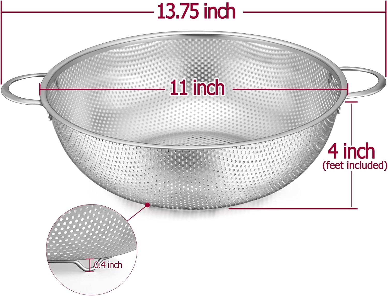 - QUICK DRAINING β Closely spaced holes on the whole surface for draining water faster and without tilting the metal strainer to avoid the food flowing out, Tiny holes for no worry about small foods(nuts, spaghetti, noodles) slipping through