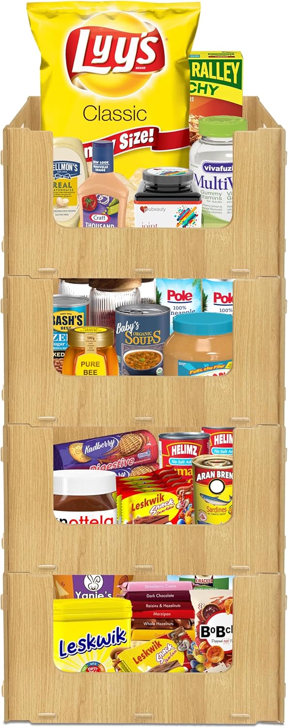Skywin TidyFriend Stackable Storage Bins for Pantry, 4 Pack Stackable Bins For Organizing Food, Kitchen, and Bathroom Essentials (Wood)