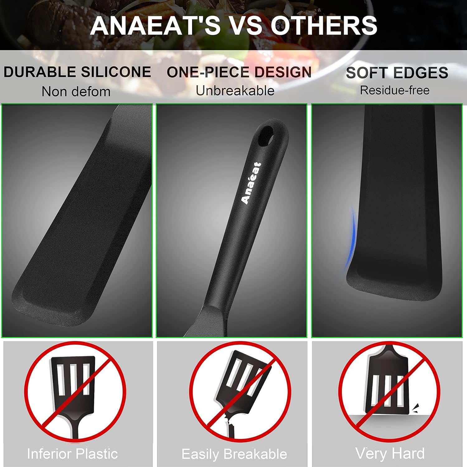 - PERFECT FOR ALL NON-STICK SURFACES COOKWARE - Anaeat a must have durable spatula for cooking with nonstick cookware and bakeware, our spatula is designed not to scratch or damage nonstick, enamel coated or glass pots and pans, ensuring a long-lasting and durable kitchen accessory for all your cooking needs. Hygienic solid silicone design is Perfect for cooking, baking, mixing, flipping and so on.