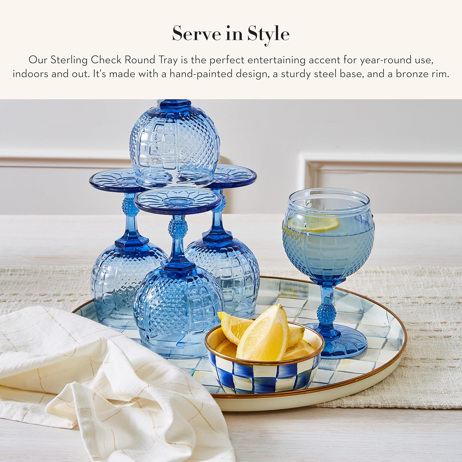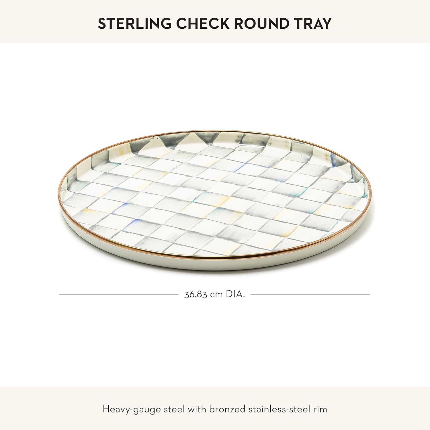 MACKENZIE-CHILDS Enamel Round Tray, Unique Serving Platter for Food and Drinks, Gray-and-White Sterling Check