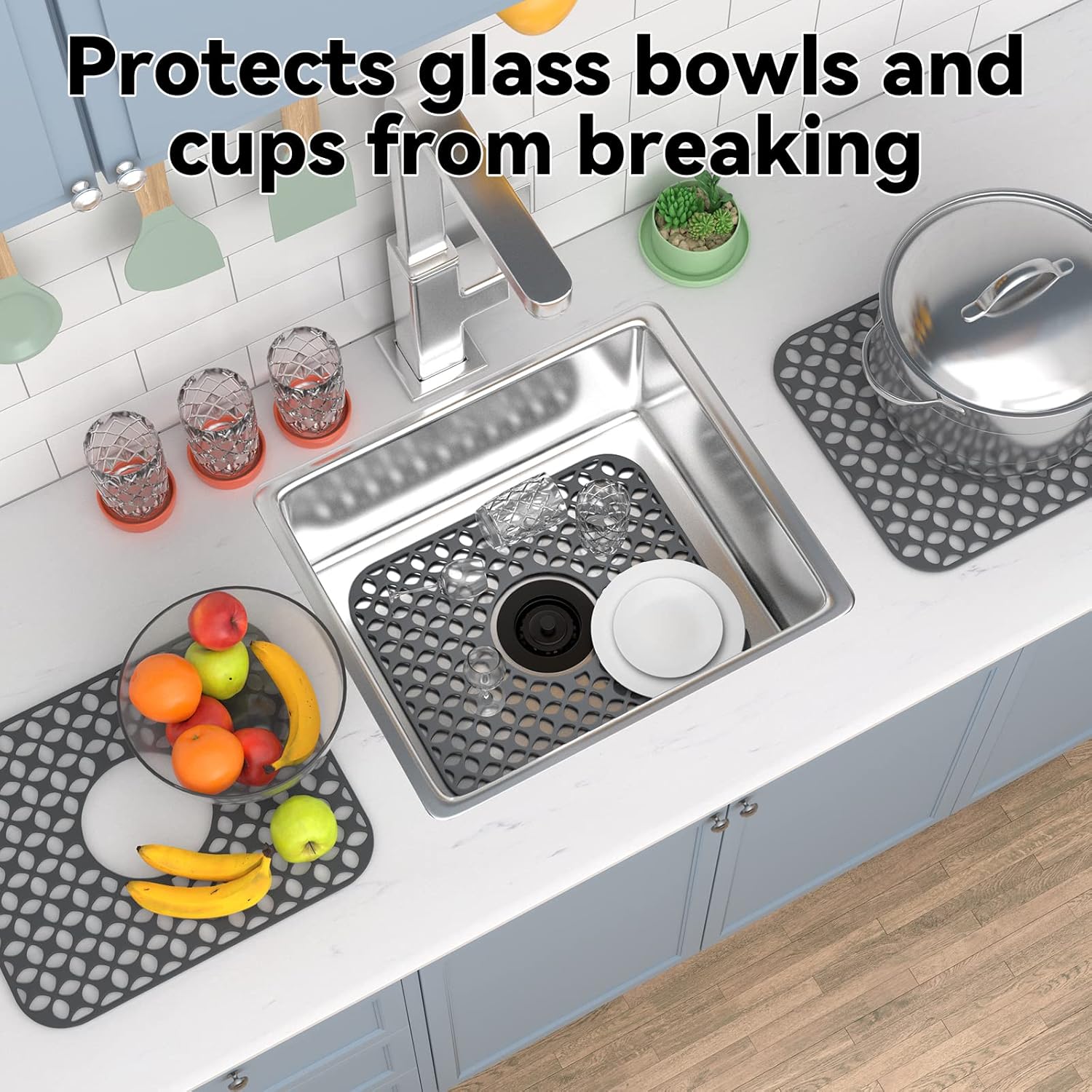 - Versatile Sink Mat: Silicone material sink mats can be bent and folded without deformation and will not rust or darken, good flexibility and curved edges can better fit the bottom edge of the kitchen sink, they not only won't scratch and damage the kitchen countertop or sink, but also can protect glass, ceramic bowls and wine glasses from accidental breakage, providing safety for your kitchen utensils