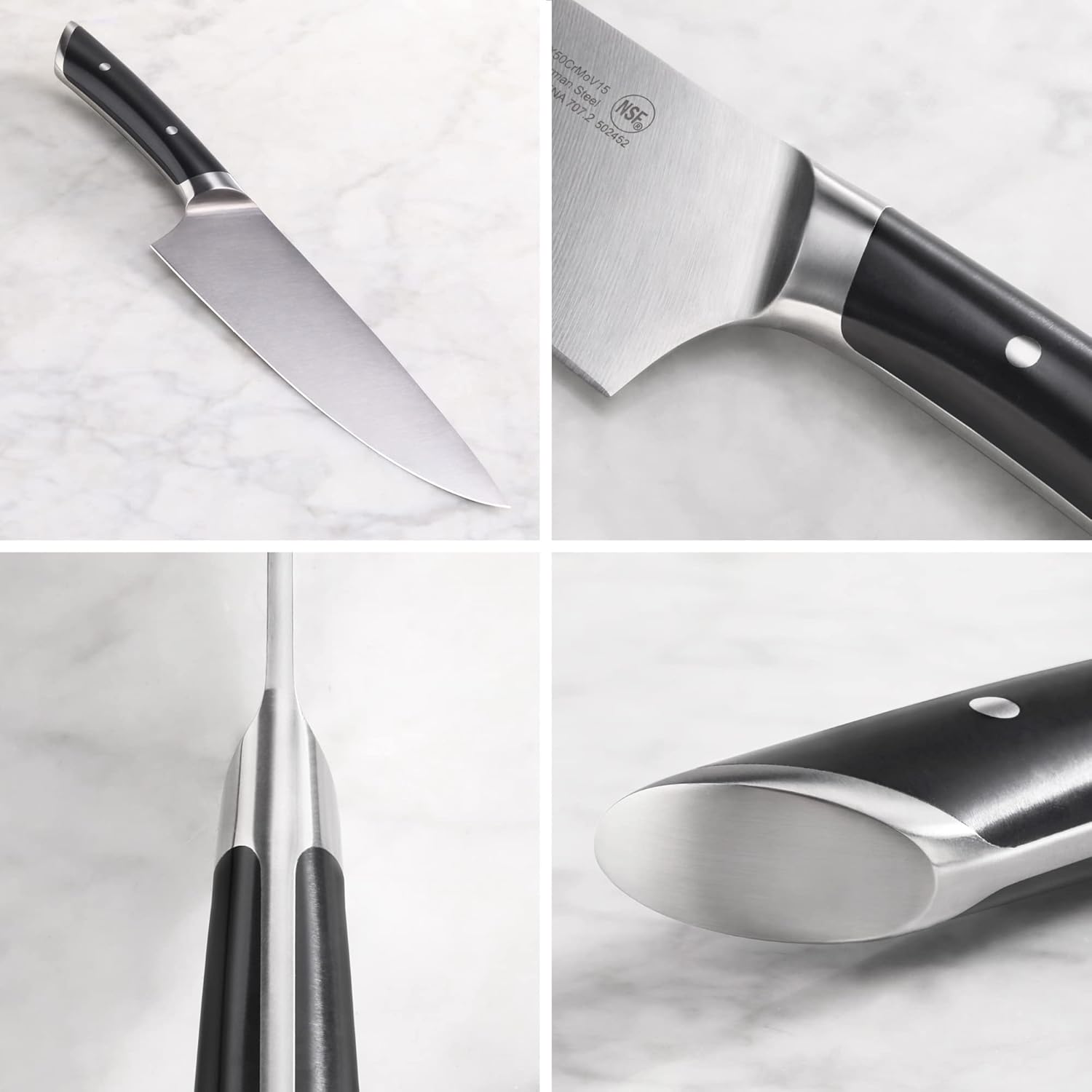 - Handcrafted, full-tang knives forged from tight-grained, German X50CrMoV15 steel for incredible durability, stain resistance, and edge retention. Blades are sharpened to a precise 16-degree angle.