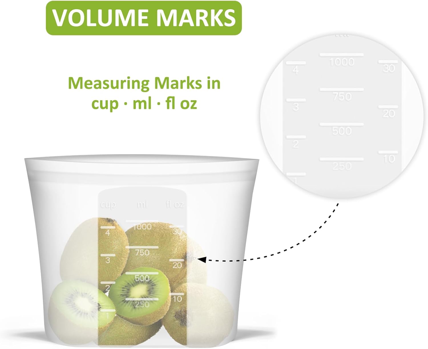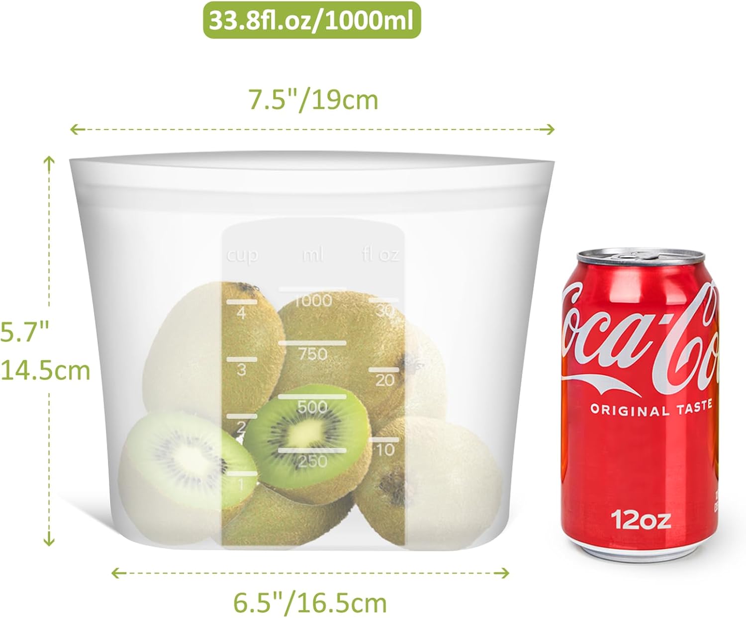 - ăTHOUGHTFUL & ECONOMICALăSmall size: 33.8fl.oz/1000ml. This silicone ziplock bag features clearly marked measurements in cups, milliliters, and fluid ounces for easy use. The translucent body helps to get a glimpse of what's inside, though not in crystal clear detail. Its robust construction ensures improved strength and durability. Plus, One silicone bag can reduce up to 300+ single-use plastic bags a year, helping to create a waste-free world and save you a lot of money.