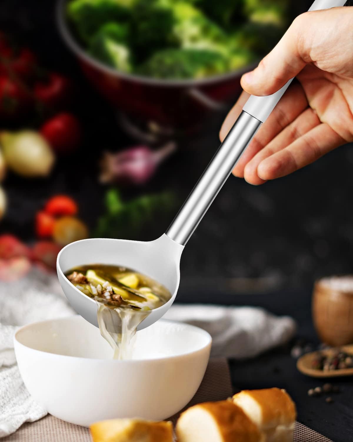 - More Safe and Healthy : Our kitchen ladle spoons are made of food-grade silicone, free of BPA;Even at high temperatures, there is no need to worry about melting or deforming;And the soft silicone head won't scratch the coating, it can better protect your pot