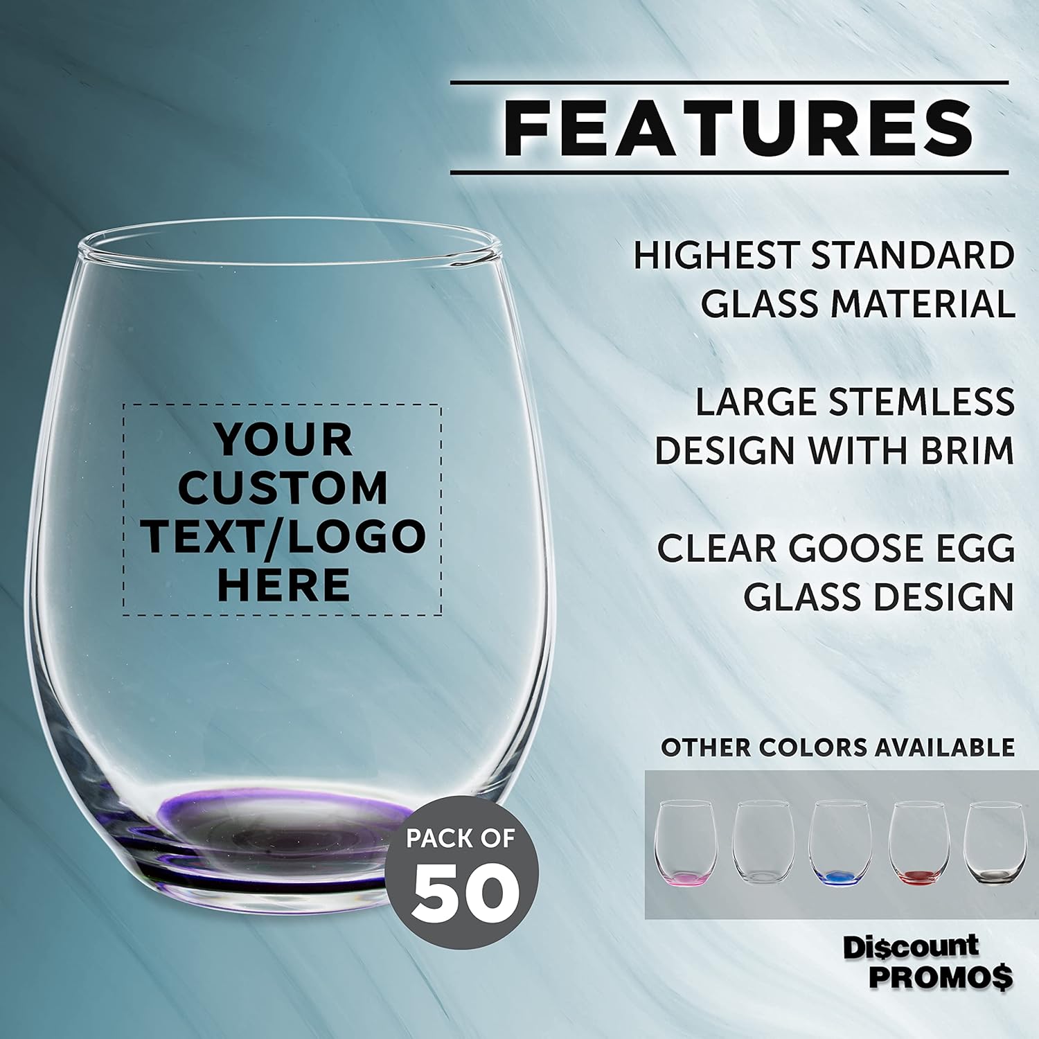 Custom Stemless Wine Glasses in Bulk by ARC Perfection, 15 oz, 50 pack, Personalized Text, Logo, Purple or White Wine Glass Set, Purple