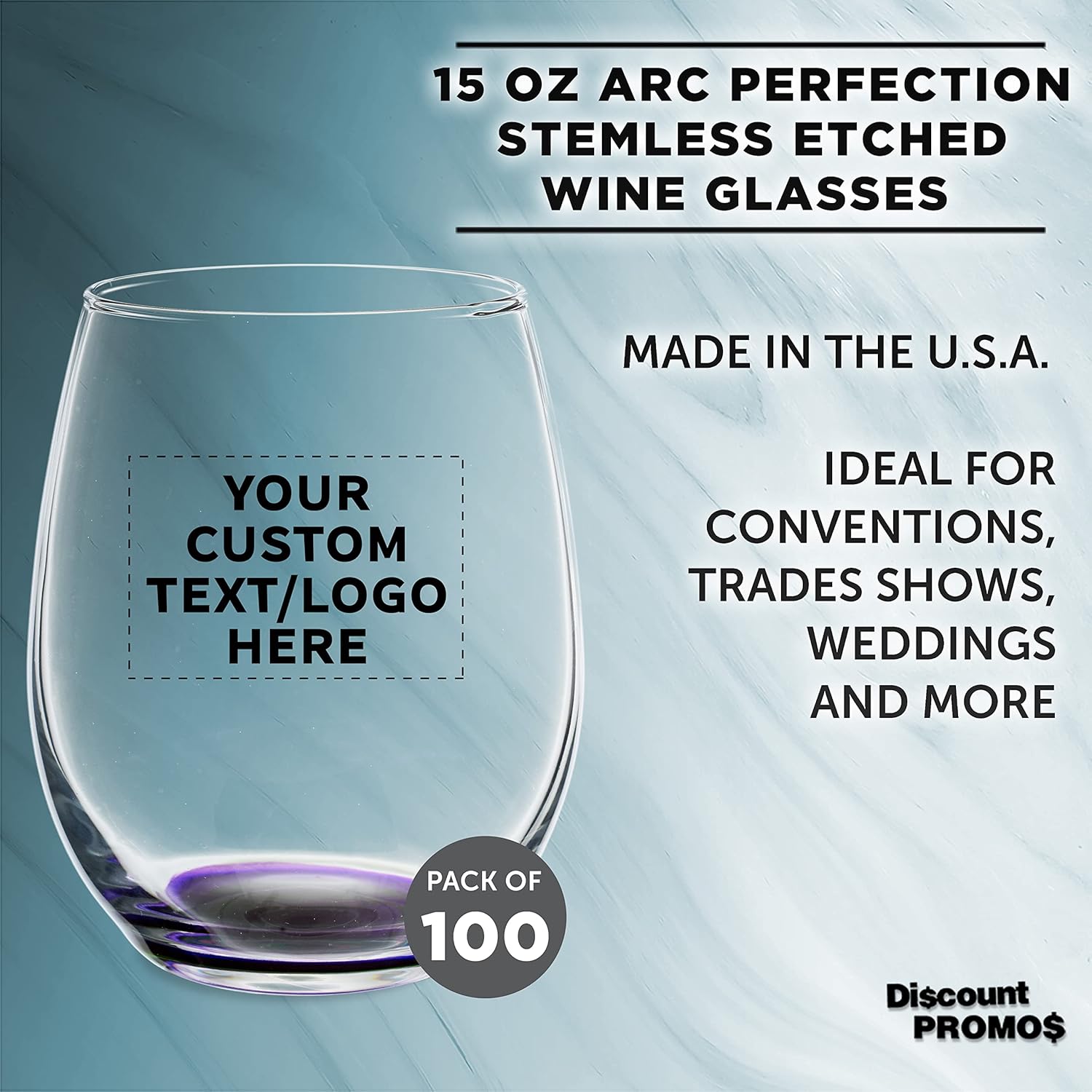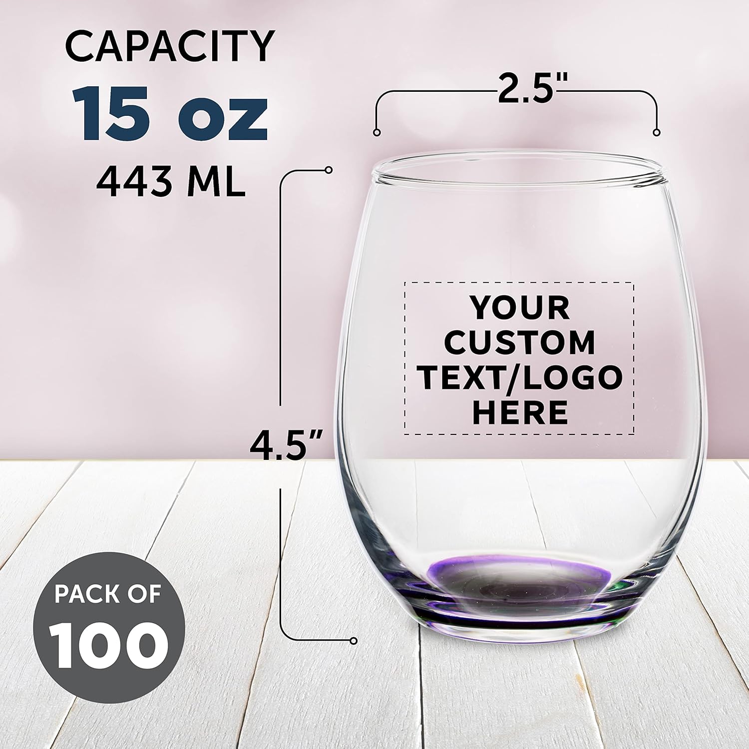 Custom Stemless Wine Glasses in Bulk by ARC Perfection, 15 oz, 100 pack, Personalized Text, Logo, Purple or White Wine Glass Set, Purple