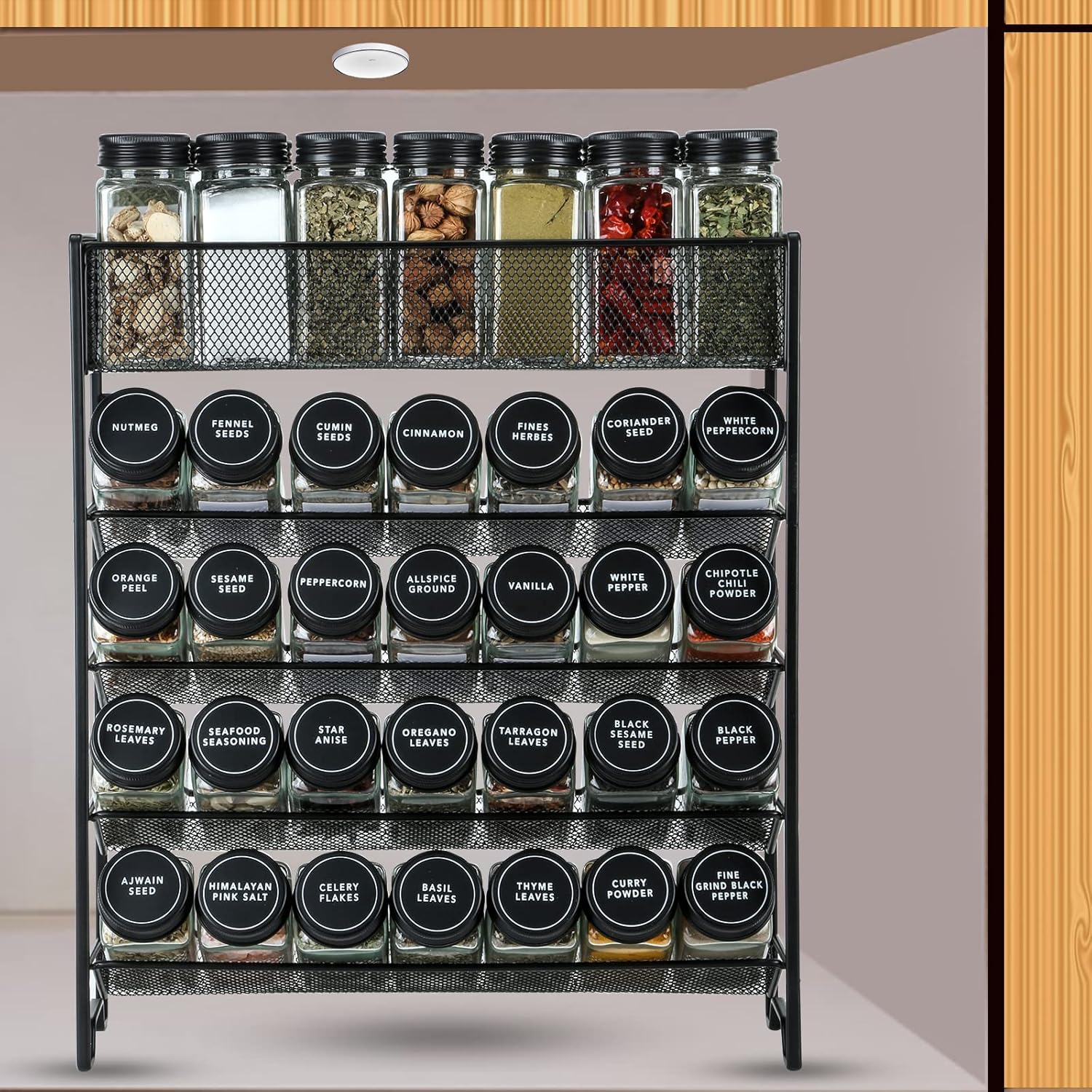 Spice Rack Organizer with 28 Spice Jars, Black Lids,Spice Labels, Chalk pen and Funnel Set for Cabinet, Countertop, Pantry, Cupboard or Wall Mount