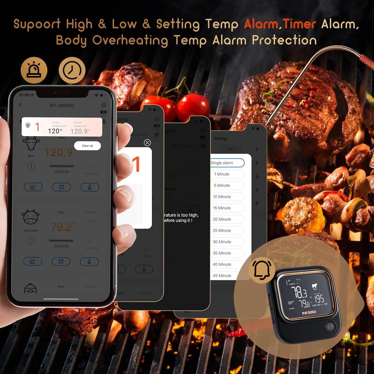 5GHz WiFi & Bluetooth 5.1 Meat Thermometer, Inkbird WiFi Grill Meat Thermometer for Grilling Smoker BBQ Cooking with 4 Probes, IBT-26S Wireless APP Control, Alarm Timer, Backlit LCD, Rechargeable