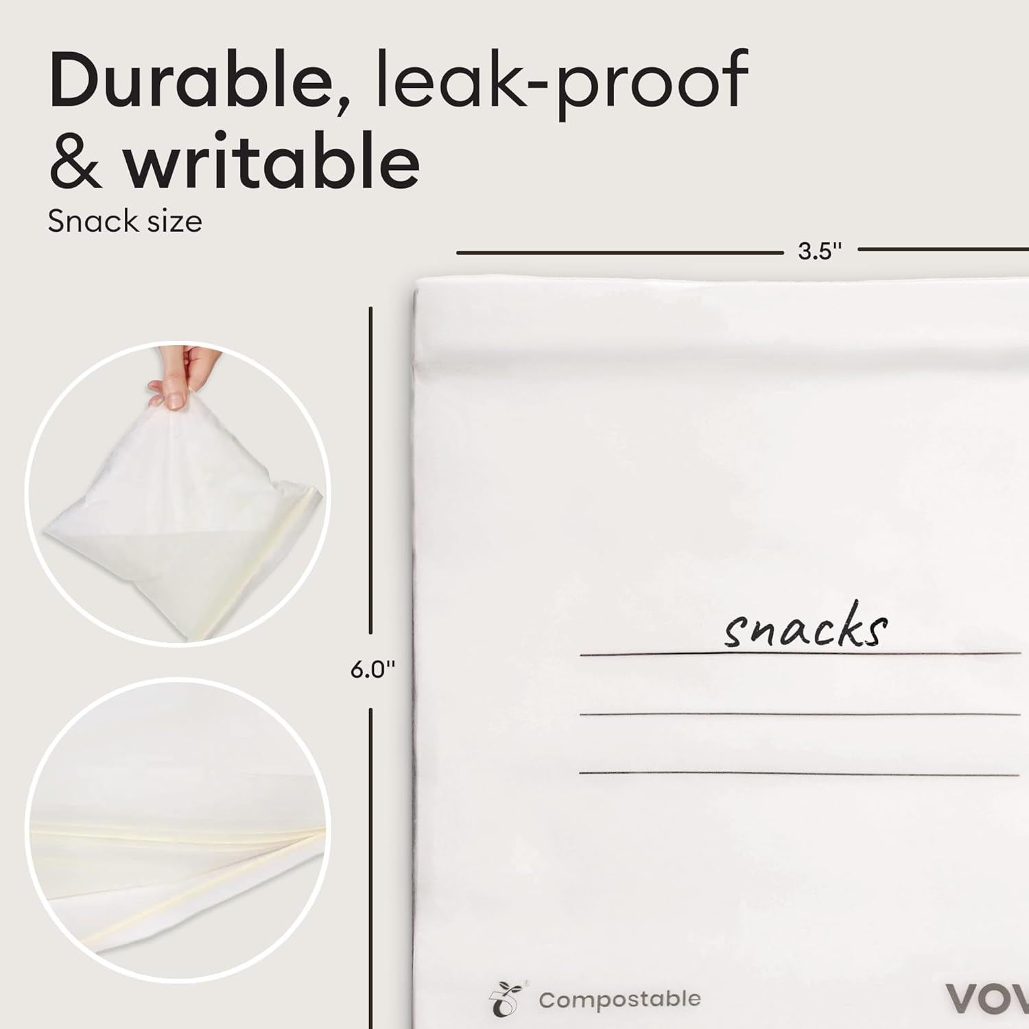 Vove Compostable Snack Bags, Small 50 Count – Freezer Safe, Leak Resistant, Non Toxic, Writable & Reusable Food Storage, Plastic-Free Eco Bags