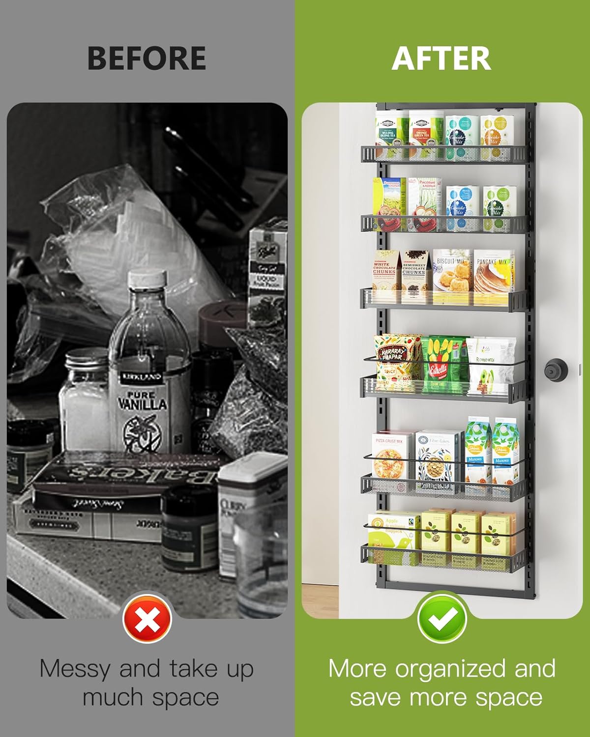 6-Tier Over the Door Pantry Organizer, 2 in 1 Large Door Spice Rack with Adjustable Metal Baskets, Heavy Duty Hanging or Wall Mounted Storage Organizer for Kitchen Pantry and Room Wall