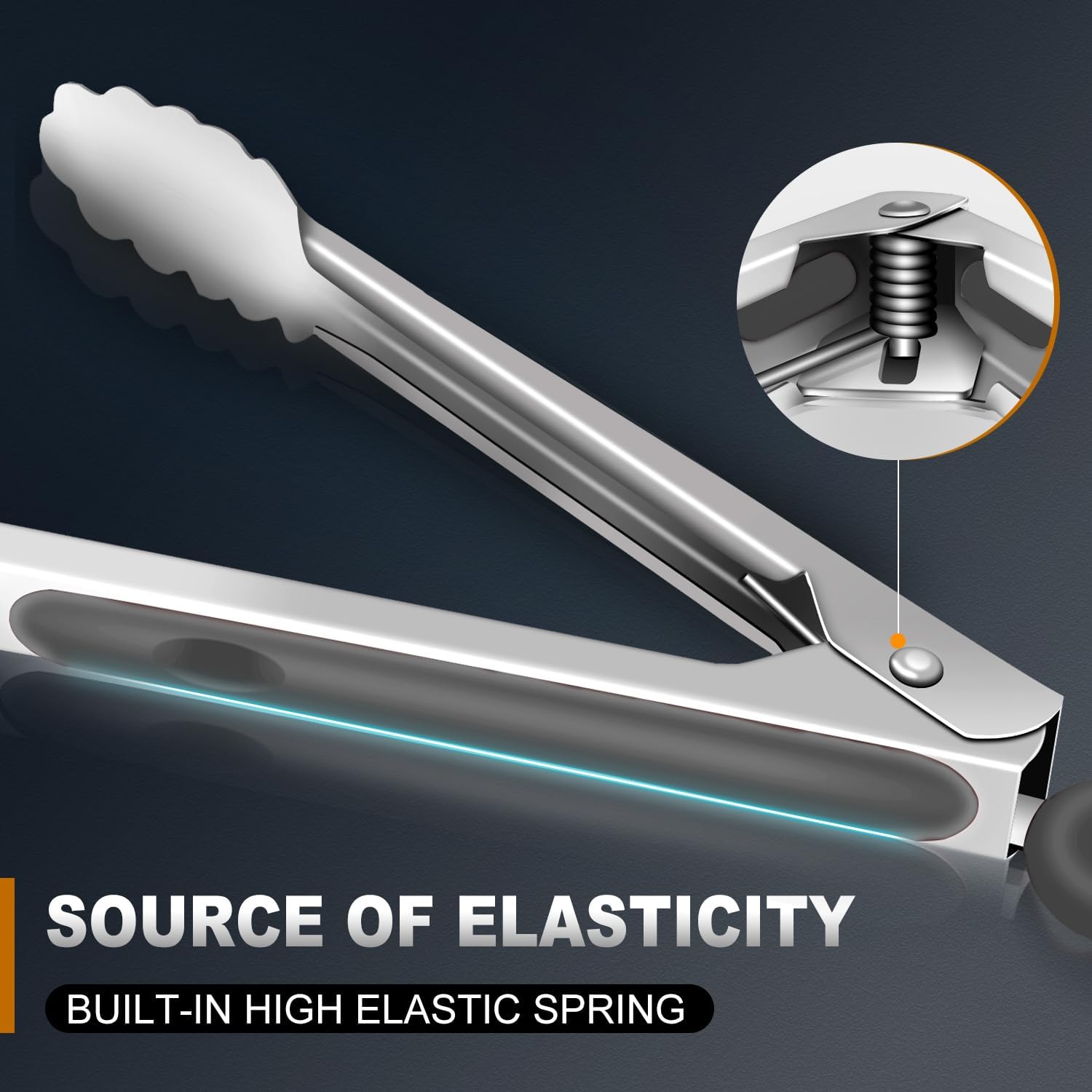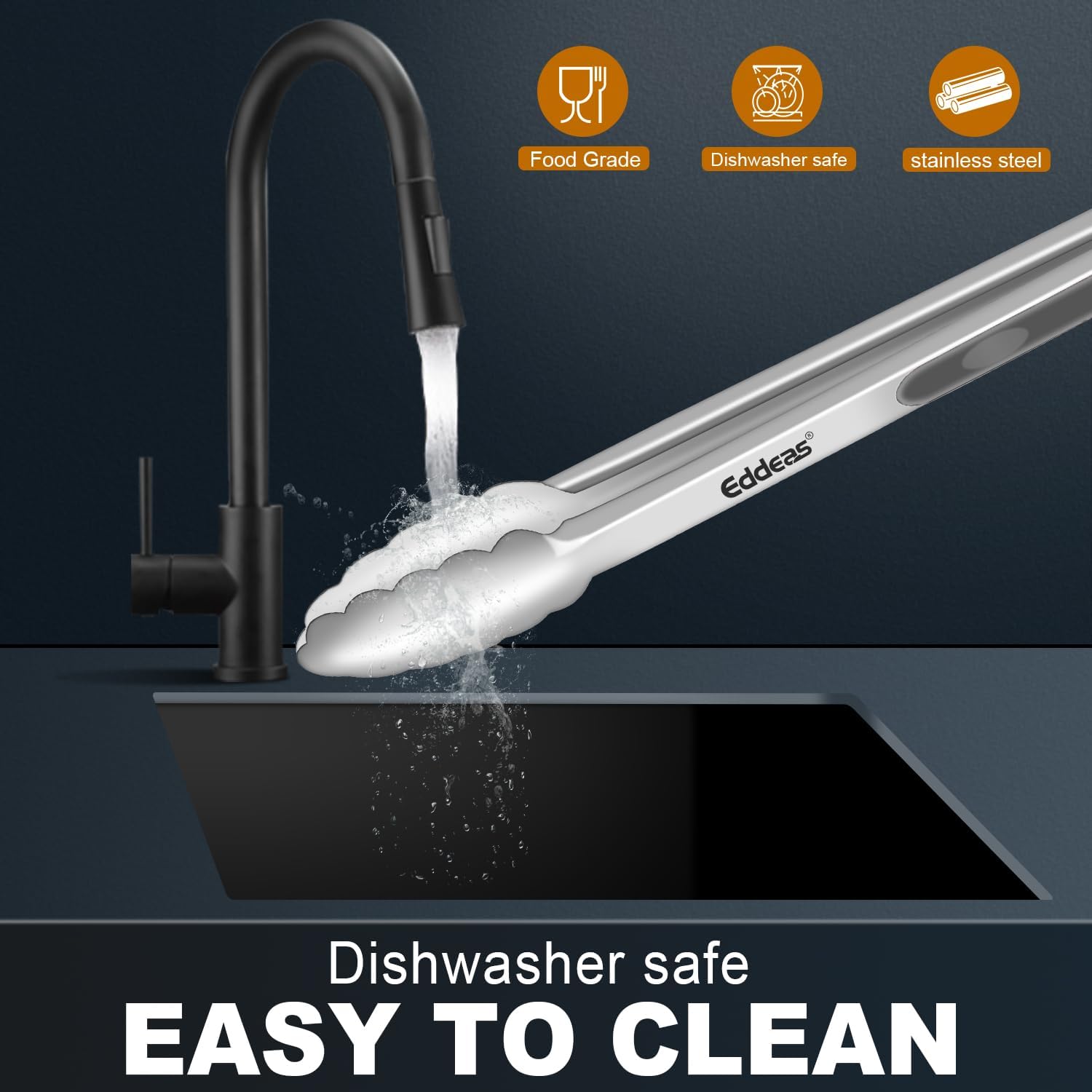 - FOOD LEVEL STAINLESS STEEL: kitchen tongs The heavy duty EDDEAS kitchen tongs built with stainless steel, sturdy, heat resistance, anti-rust, anti-corrosion, light weight, easy to handle like new forever. This tongs for cooking comes with a set of 3, standard7"Serving Food Tongs 9" cooking tongs and large sized 12" BBQ grill tongs.