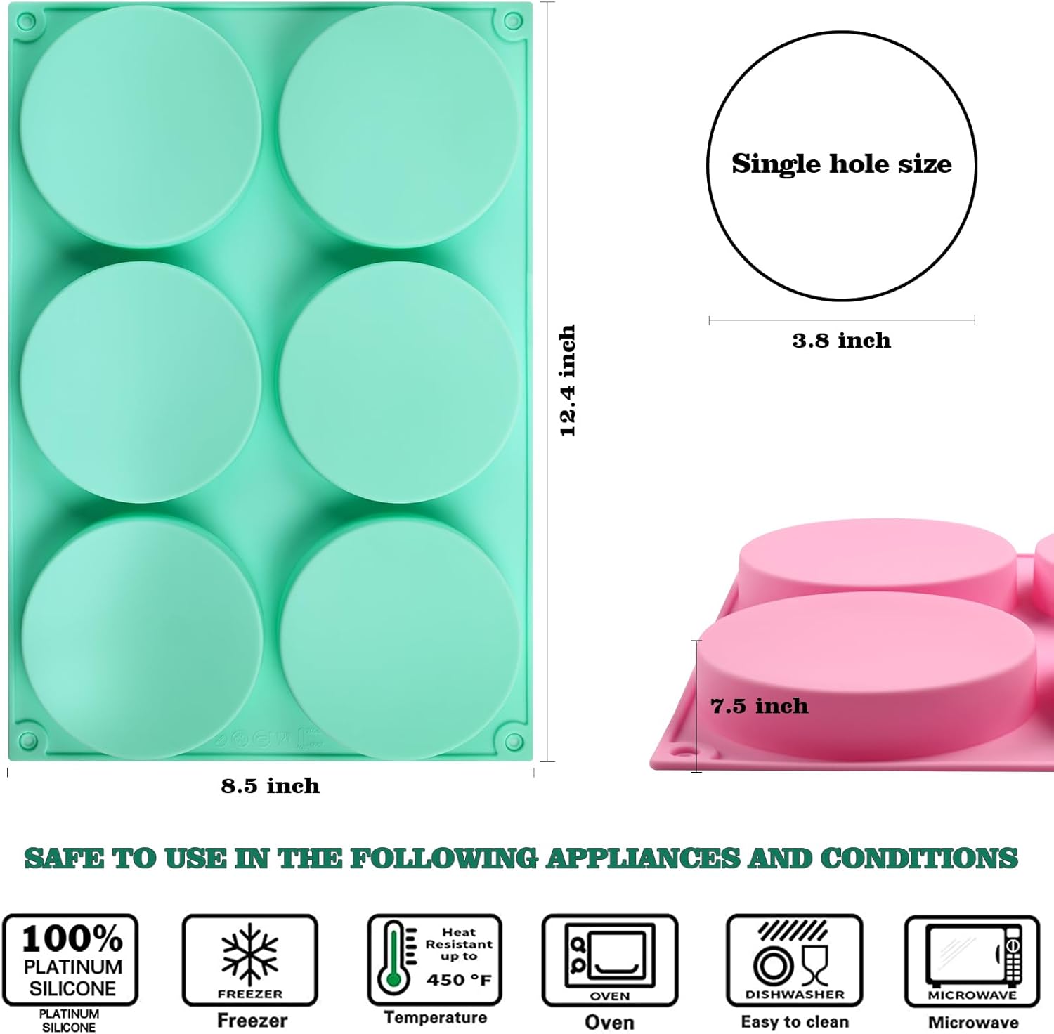 - 【6 Cavity Silicone Round Mold】You will receive two large silicone cake molds, pink and baby green, with silicone molds measuring 12.5 x 8.5 x 0.9 inches each with 6 cavities measuring 3.8 inches each.