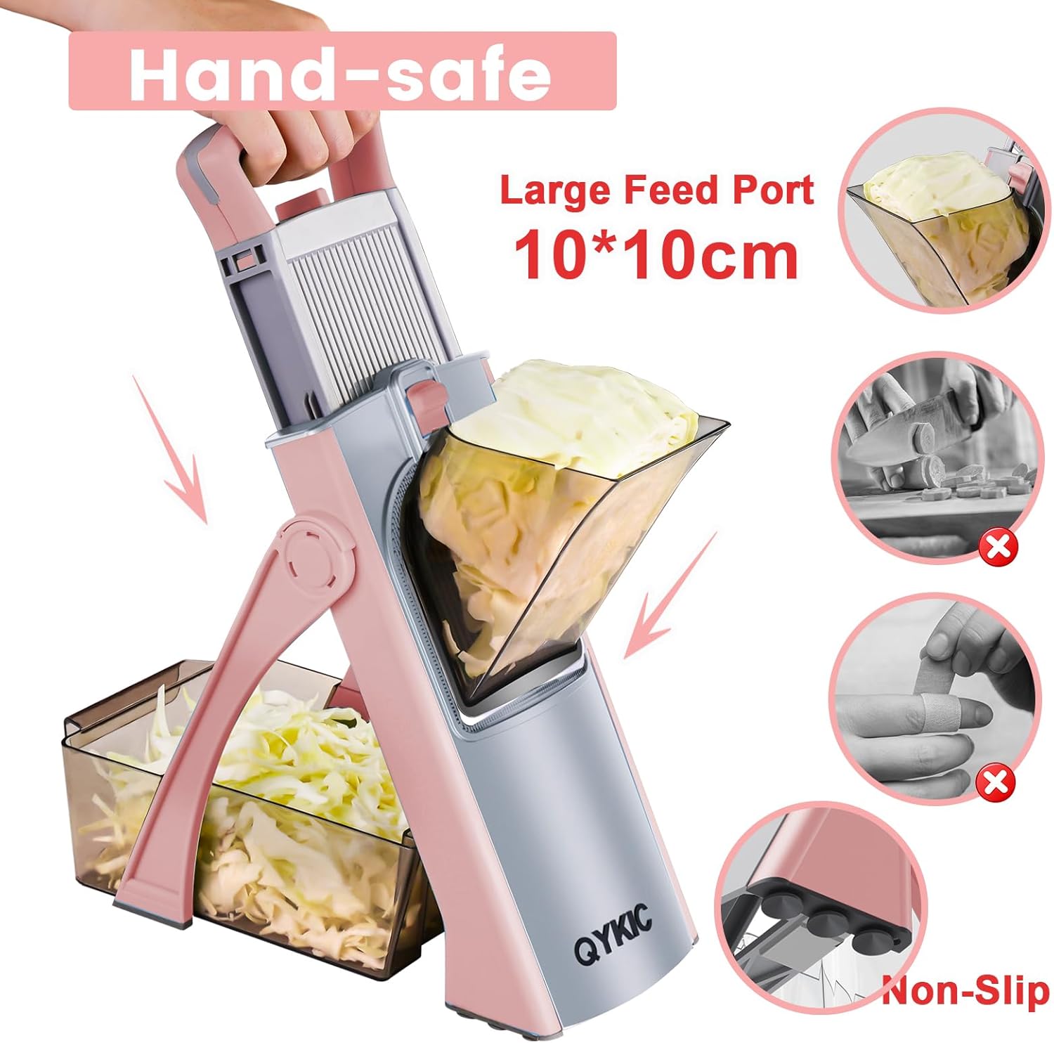 - ✅MULTIFUNCTIONAL : QYKIC vegetable chopper With 35+ slicing options, the mandoline slicer cuts perfectly-even slices from 0.5-8mm in thickness while also offering julienne, matchstick and dicing options. suitable for cutting potatoes, garlic, onions, carrots, onions, cucumbers, eggs, vegetables and fruits. tips: please do not cut meat.