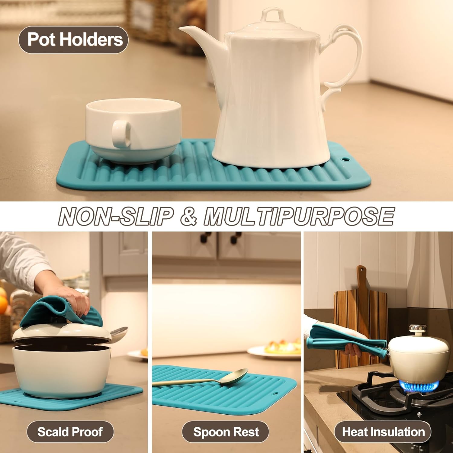 - MULTIPURPOSE KITCHEN TOOLS - Our silicone trivets for hot dishes are non-slip, flexible and soft enough to comfortably grab hot pots and pans, jar opener, drying mat or potholders. Silicone hot pads for kitchen are perfect for use in an oven, microwave, or freezer, protect your hands from hot and cold.
