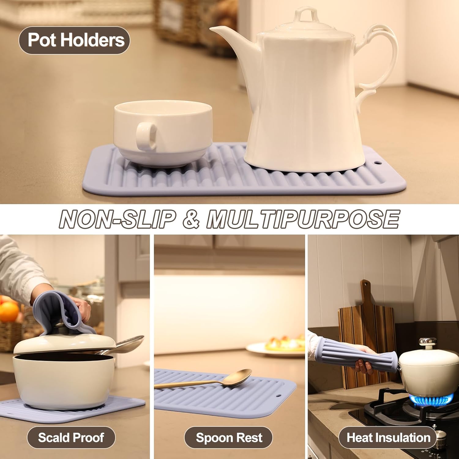 - MULTIPURPOSE KITCHEN TOOLS - Our silicone trivets for hot dishes are non-slip, flexible and soft enough to comfortably grab hot pots and pans, jar opener, drying mat or potholders. Silicone hot pads for kitchen are perfect for use in an oven, microwave, or freezer, protect your hands from hot and cold.