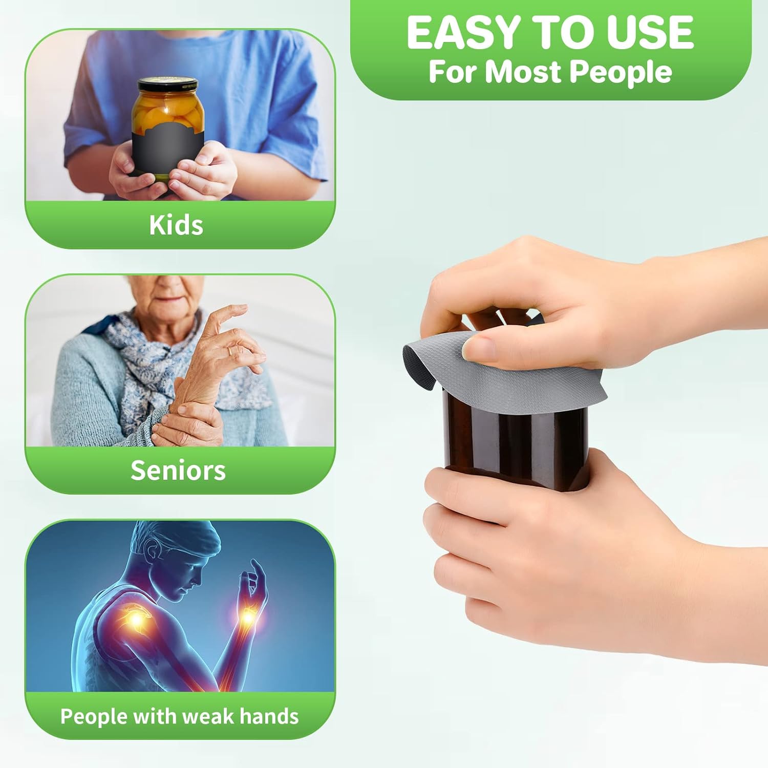 - Easy To Use: Simply place the rubber jar opener on the lid, and rotate the lid as usual, the lid will be easily unscrewed. Ideal for seniors and people with weak hands.