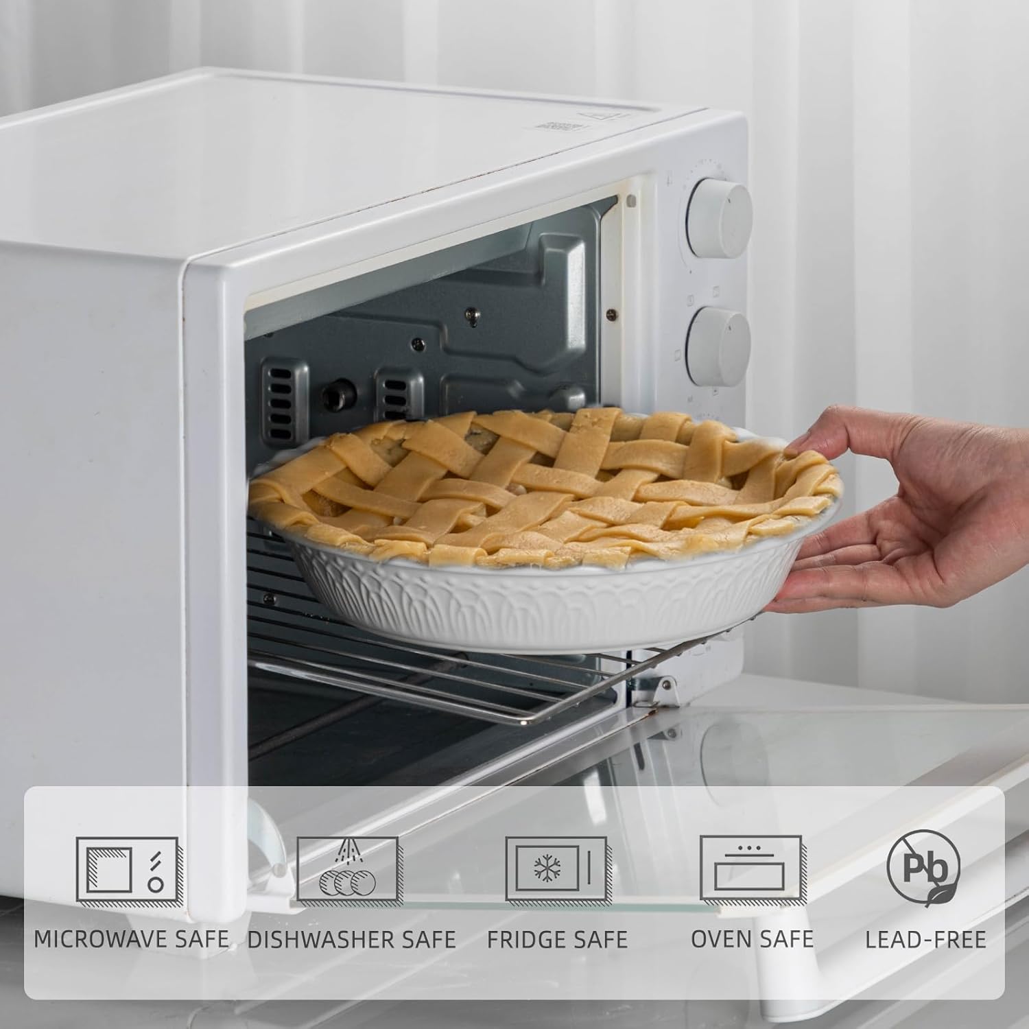 - Microwave, Oven & Dishwasher Safe: Smooth glazed surface makes this pie pan for baking 9 inch easy to clean. Just put it directly into the dishwasher and it comes out spotless.