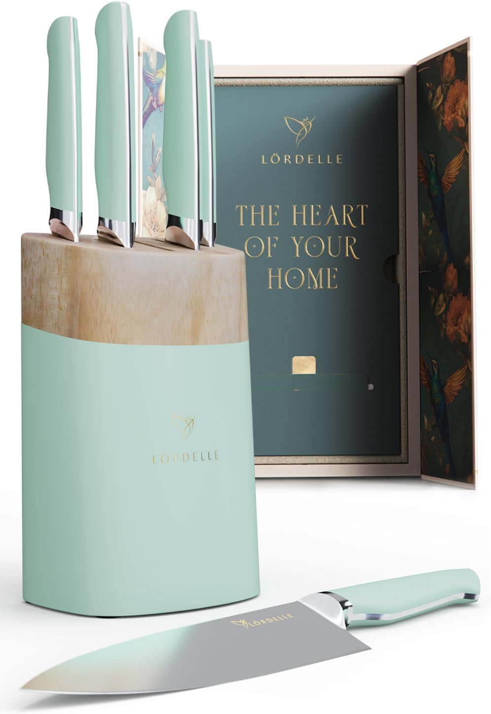 Lordelle Knife Block Set - 5 Piece Set - Coastal Green - Lifestyle Home Kitchen Design - German X50 Stainless Steel - ABS Handle - Ash Wood Block - Cooking Chef Knife, Santoku, Paring, Utility