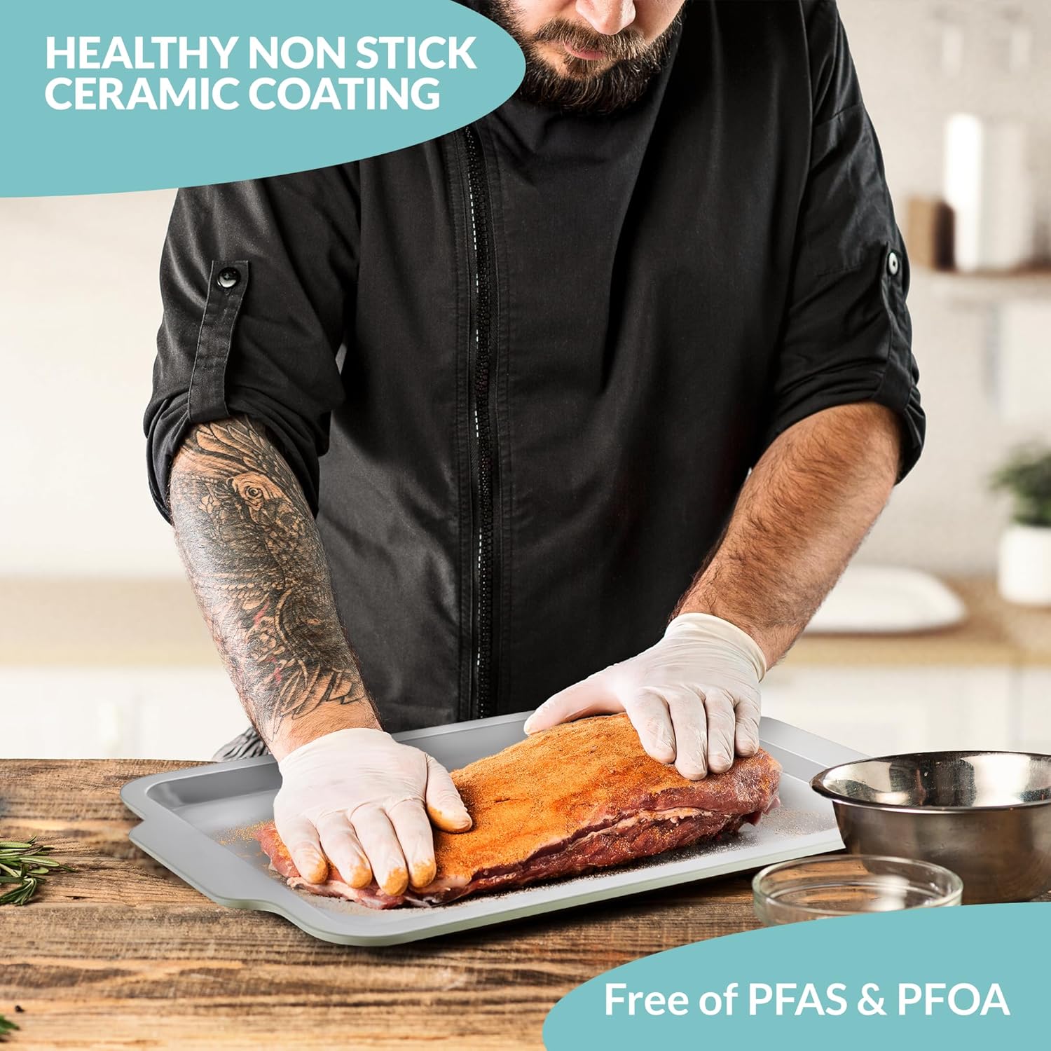 - EASY TO CLEAN: Our ceramic baking sheet is nonstick, making it super easy to clean. No more scrubbing on this cookie pan. Simply rinse off or toss in the dishwasher.