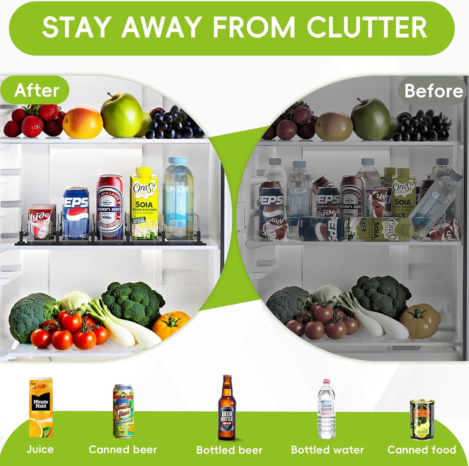 - 【Easy to Assemble and Clean】 No tools are required, which takes only a few minutes by hand, and its smooth surface and waterproof material make the refrigerator drink organizer easy to clean