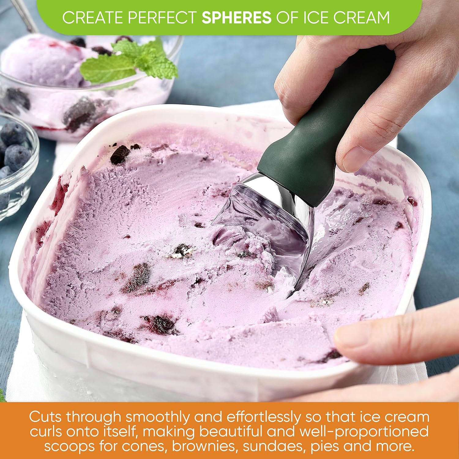 - Create Perfect Spheres Of Ice Cream - Cuts through smoothly and effortlessly so that ice cream curls onto itself, making beautiful and well-proportioned scoops for cones, brownies, sundaes, pies and more.