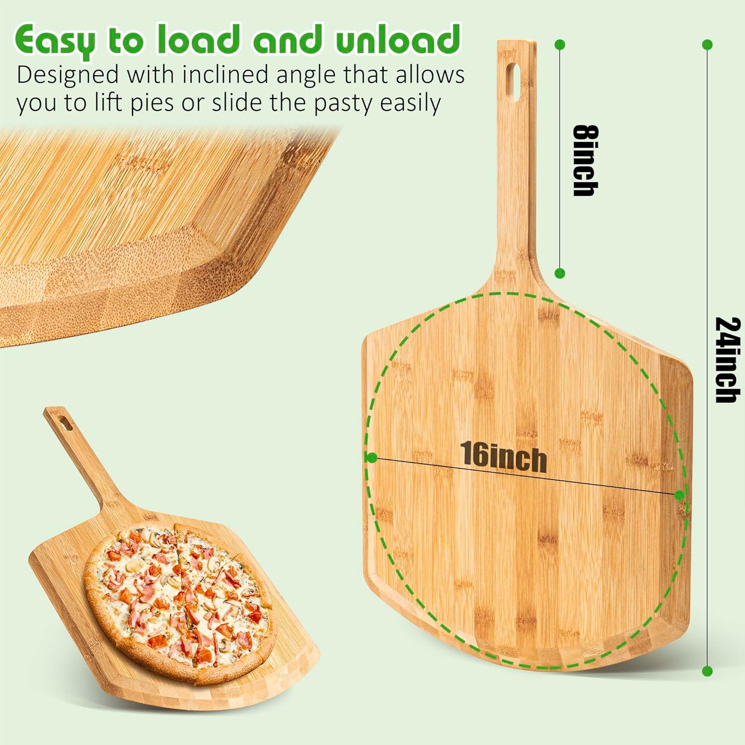 - 【16IN Bamboo Pizza Peel】Indulge in the elegance of our beautifully crafted bamboo pizza peel. Constructed with premium-quality bamboo wood, this pizza peel is built to withstand years of use. The smooth and polished bamboo surface ensures that your dough won't stick, effortlessly sliding off the peel. Measuring at 24 x 16x 0.6 inches, lightweight and easy to maneuver. Meticulously designed for long-lasting durability.