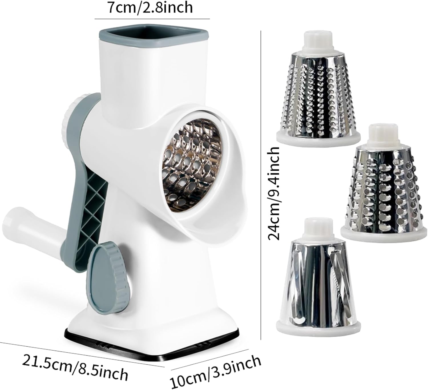 - 【Cheese Grater With handle】The cheese grater with a handle protects your hands from all sides during use: the handle replaces your hands in rotating, and the food pusher keeps your hands away from the blades. Additionally, the inward-facing design of the blade allows for safe cleaning. cheese shredder rotary is easy to clean and maintain. easy to assemble and disassemble,This slicer comes with 3 recommended blades.
