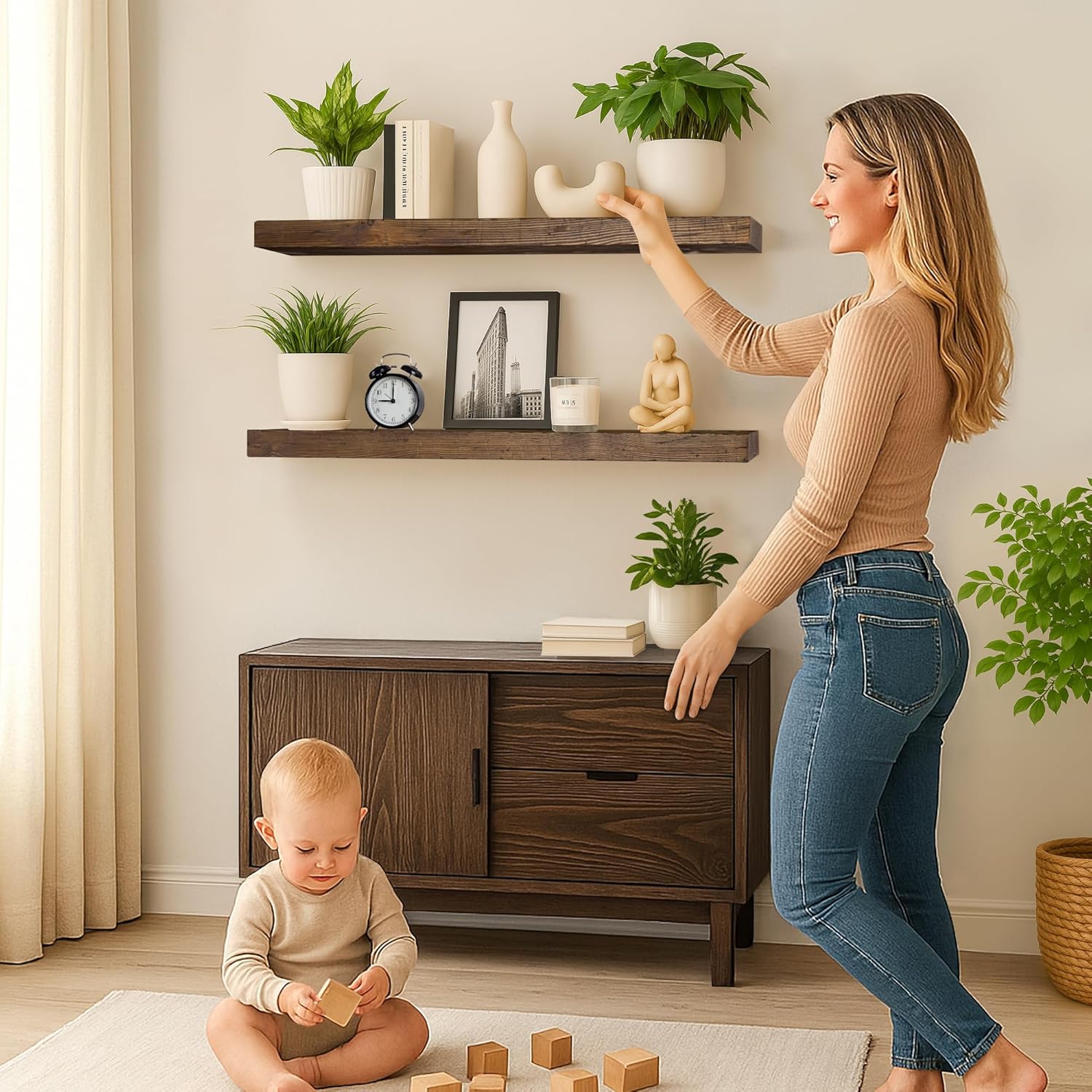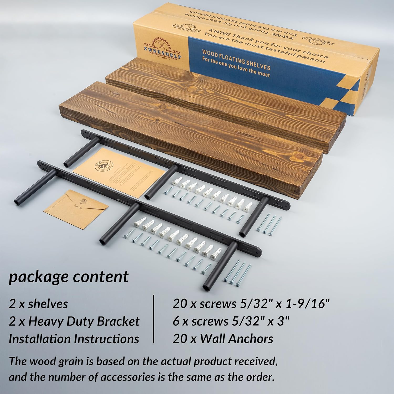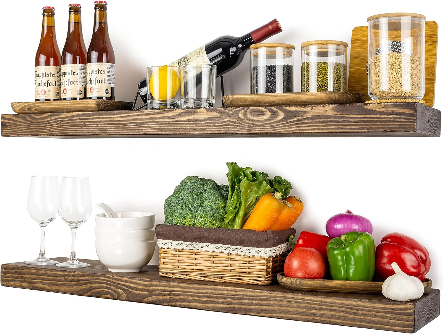 Distressed Floating Shelves 36 inch Long Set of 2,8 inch deep Solid Wood Wall Mounted Shelves for Living Room Kitchen,Book Shelf for Wall with Hidden Bracket- Distressed Black Walnut