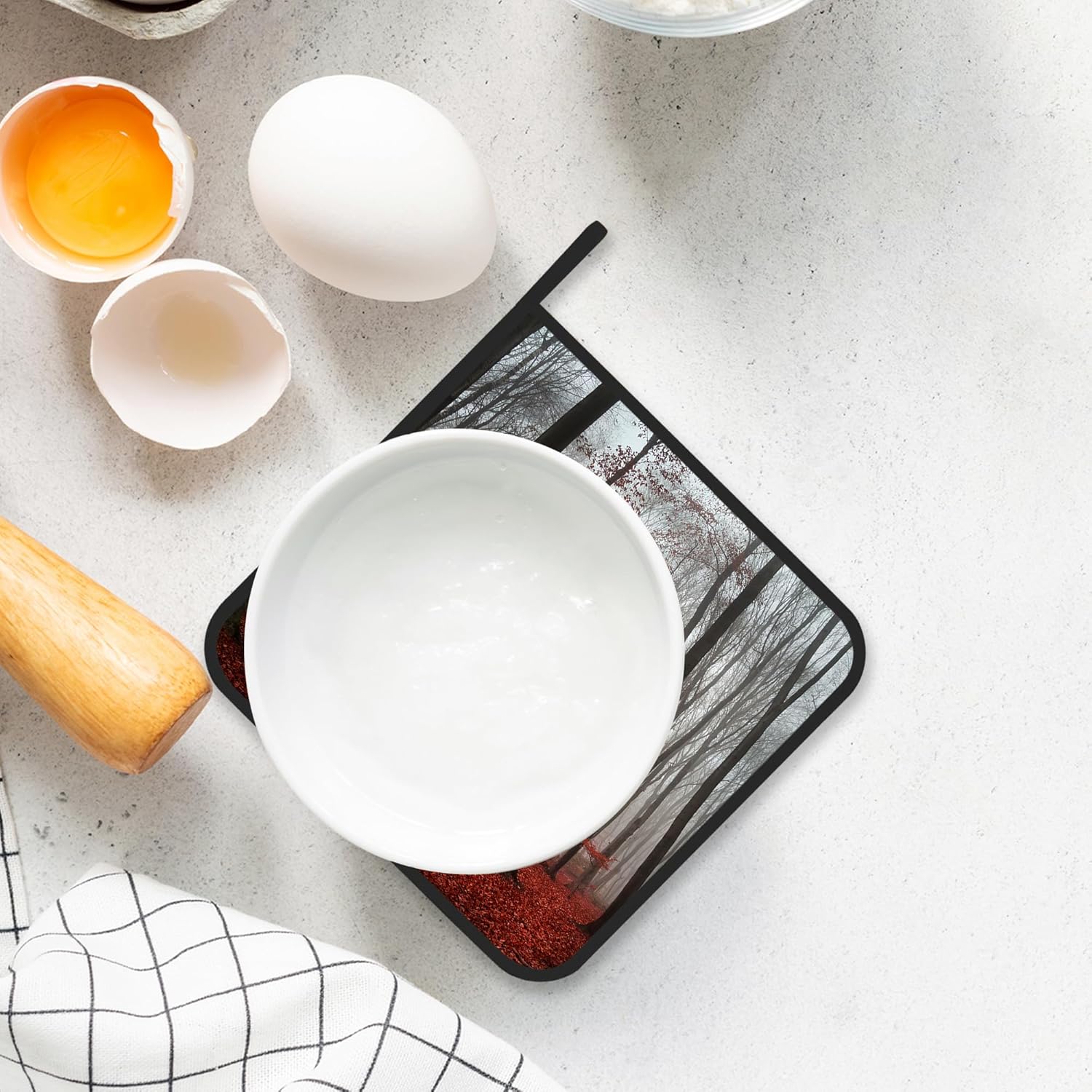 Pot Holder Set of 2,Misty Forest Red Kitchen Heat Resistant Potholder for BBQ Cooking Baking,Food Hot Pat for Women Men Kitchen Wear
