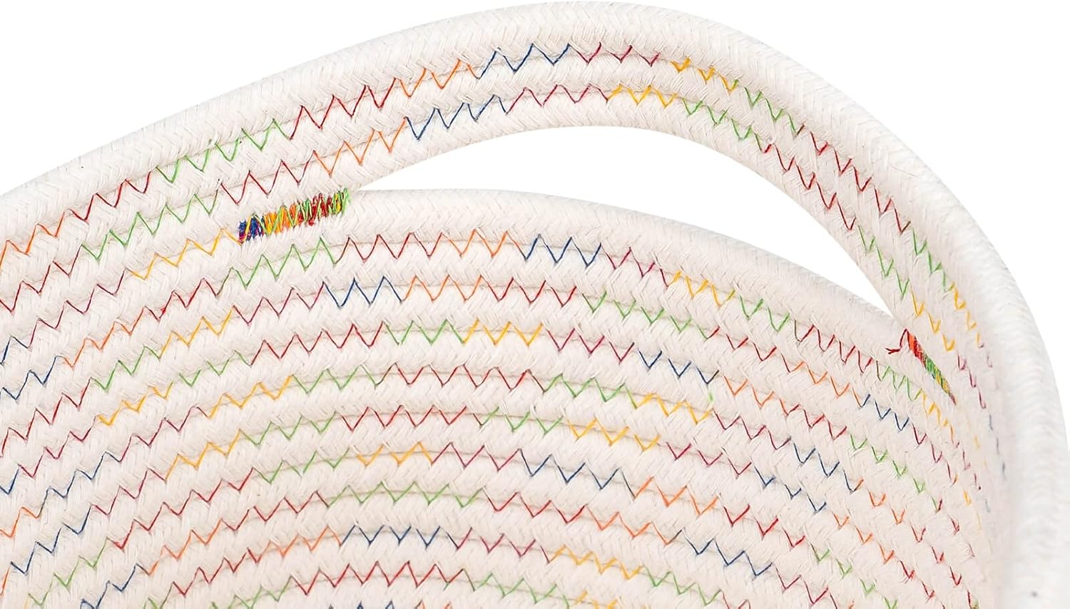 - Classy Natural Cotton Rope Storage Baskets-High quality well made. Very sturdy and a cute modern style. Durable woven rope, Long-lasting, skin-friendly, soft and attractive. You need these adorable baskets to put some supplies in, diaper, jewelry, cosmetics, makeup brushes, tea bags, storing smaller toys, toddler socks, candy