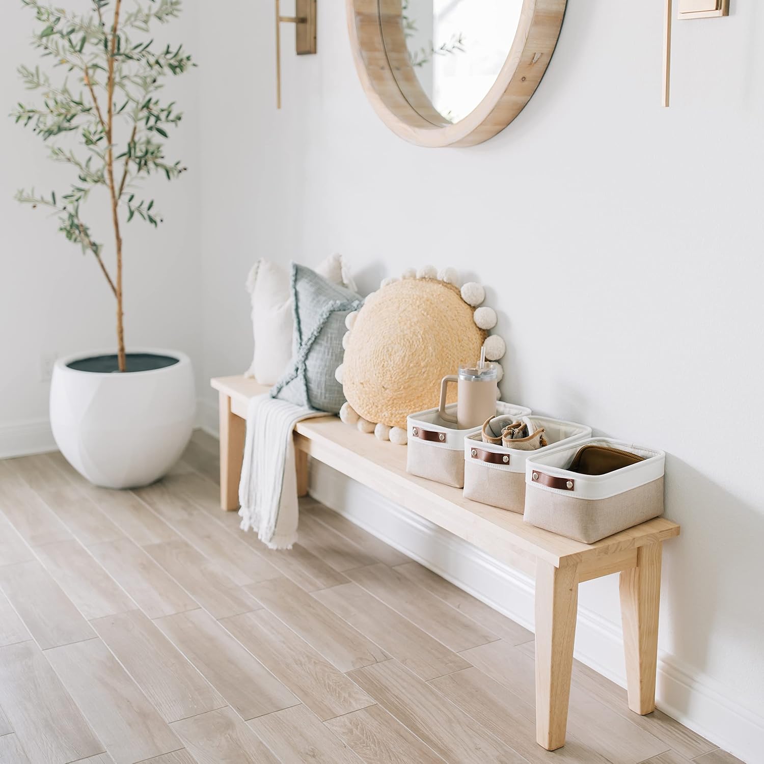 - Decorative Fabric and Vegan Leather β These versatile storage baskets for organizing your everyday life are made with a thick, high-quality fabric and fitted with leather handles to add a stylish touch to a living room, bedroom, office, or personal space.