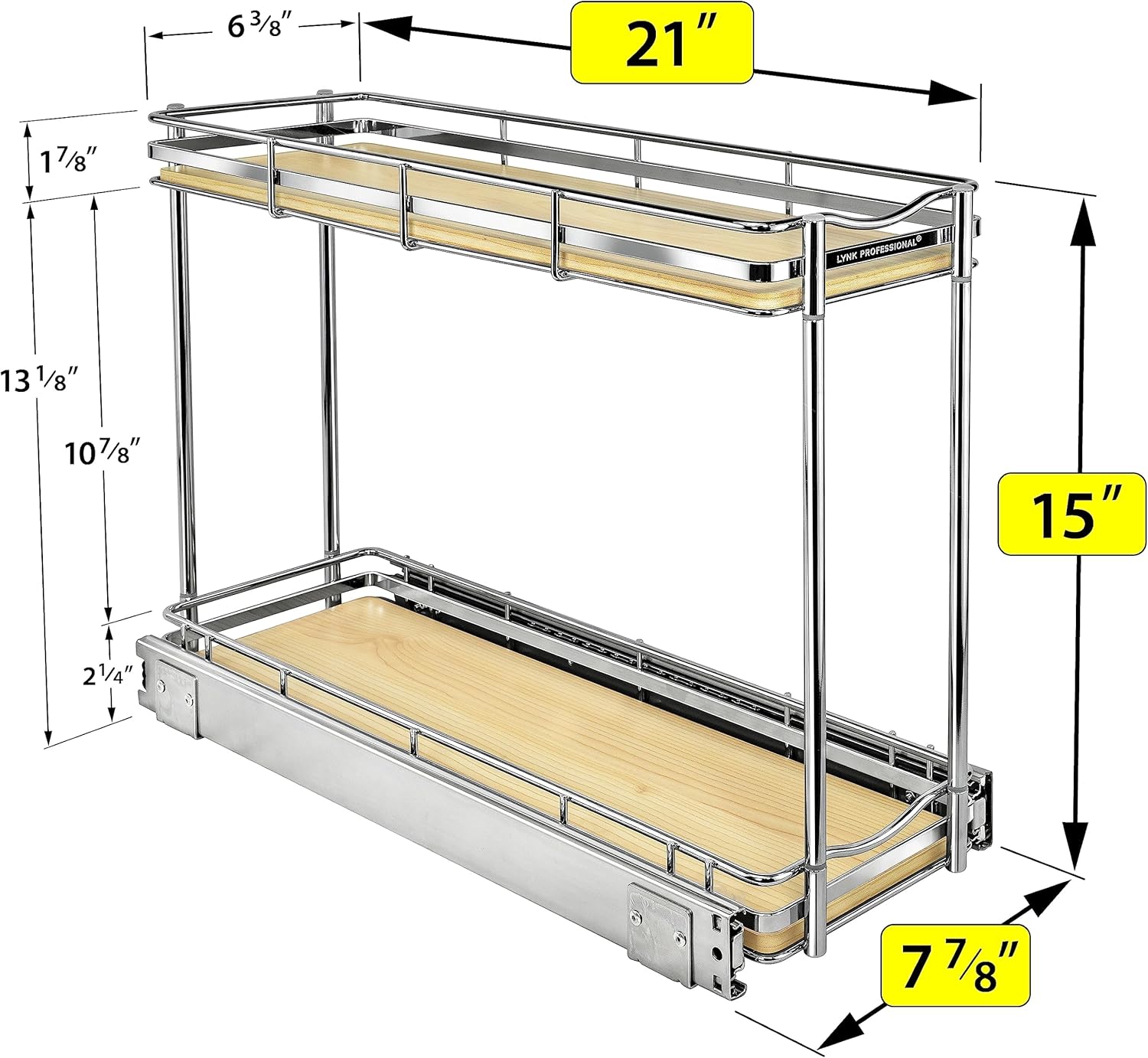 - LYNK PROFESSIONAL, THERE IS NO SUBSTITUTE! PERFECT FOR NARROW CABINET SPACES! our space-saving design needs only 8-inches of width to give you two 21-inch deep drawers that bring bottles, cans, and spices to your fingertips – elegant laminated wood, polished metal, and a brilliant anti-rust chrome finish make the inside of your cabinets as beautiful as the outside