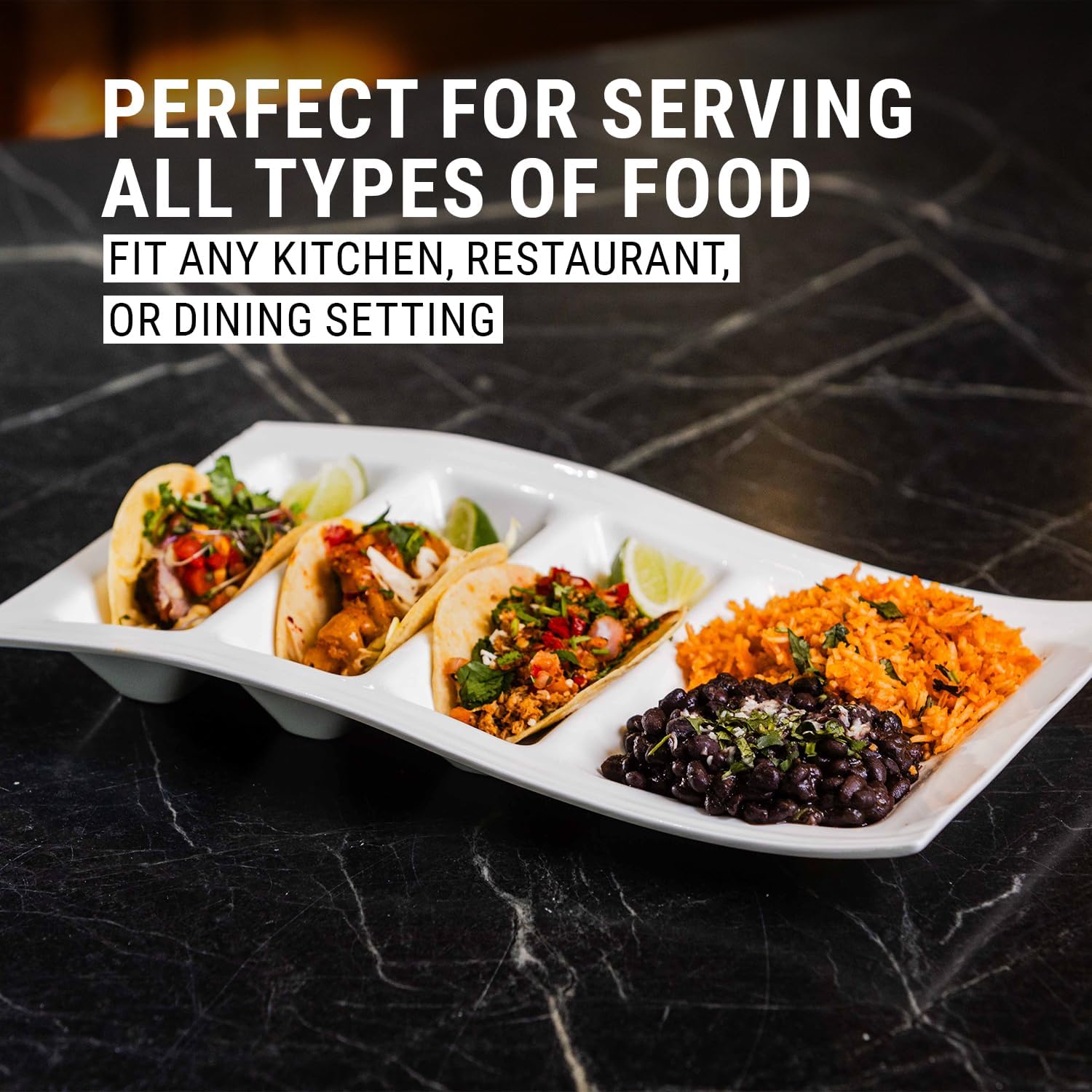 Stackable Taco Serving Plate with Dividers, Stylish China Taco Holder with 3 Slots & 1 Flat Section, Durable, Scratch-Resistant Dinner Dish for Tacos, Sushi, Appetizer, & More, Set of 2