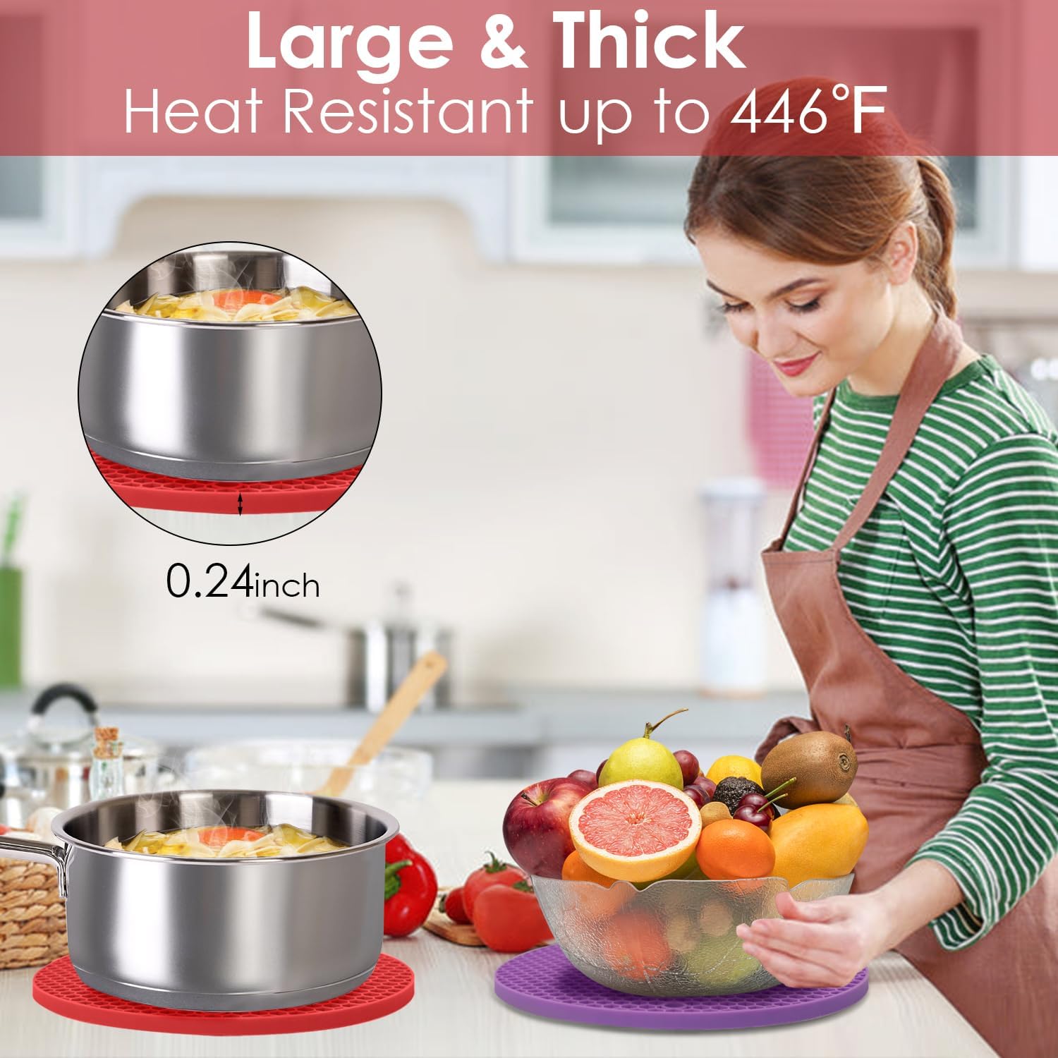 - 🥘Heat Resistant Mat & Safe to Use -The Heat-resistant temperature is: -40℉ to 446℉. The silicone trivets pad protect your kitchen countertop from being damaged, you can directly put the hot pot from the stove on the tabletop; used as pot holder and handle protector to protect the hand from being burned.