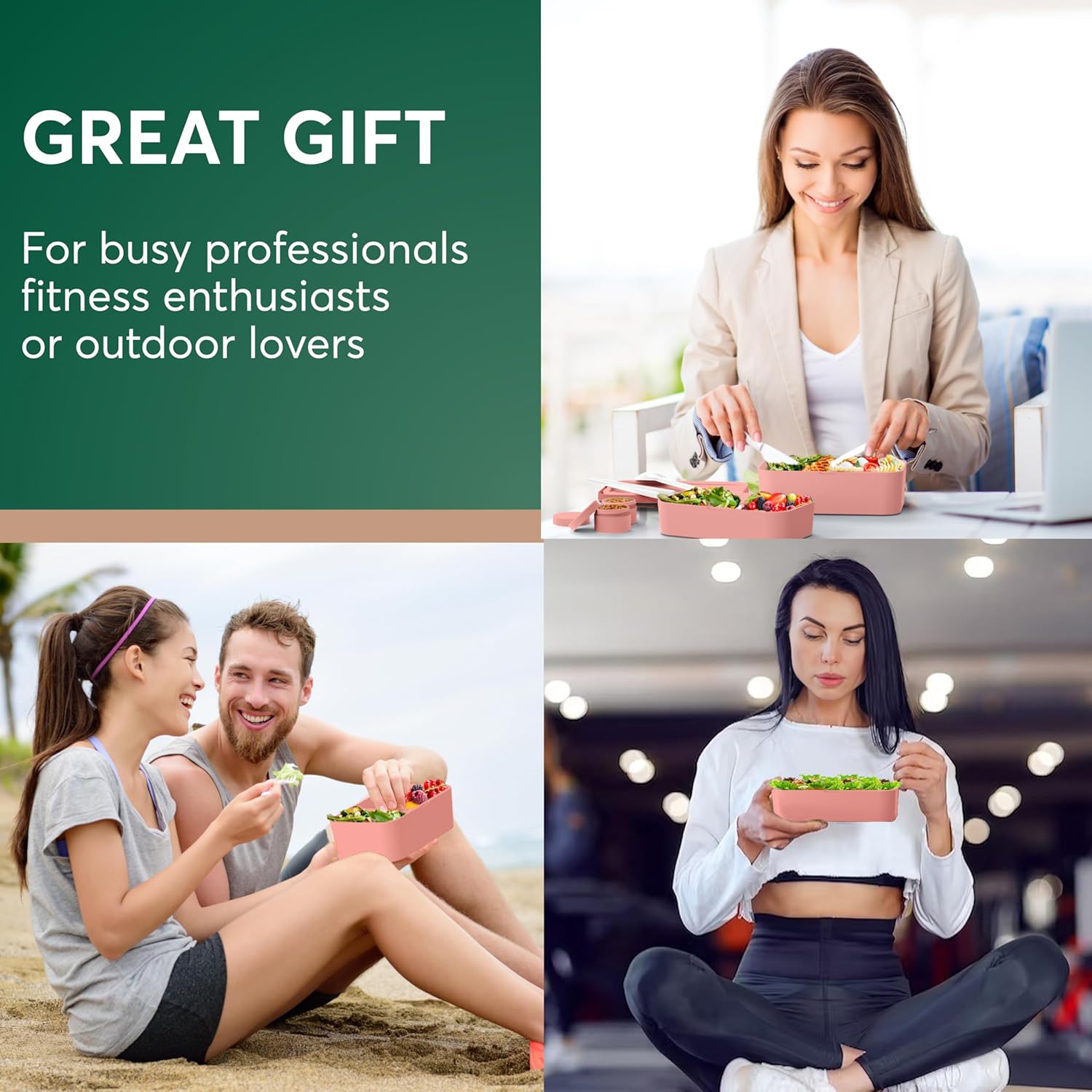 Umami Lunch Box Containers w/ 4 Utensils, Sauce Jar, Nestable Space-Saving Bento Box Adult, 100% Leakproof, Microwavable Lunch Containers for Adults, Design Award Winner, Coral Pink, 30 oz