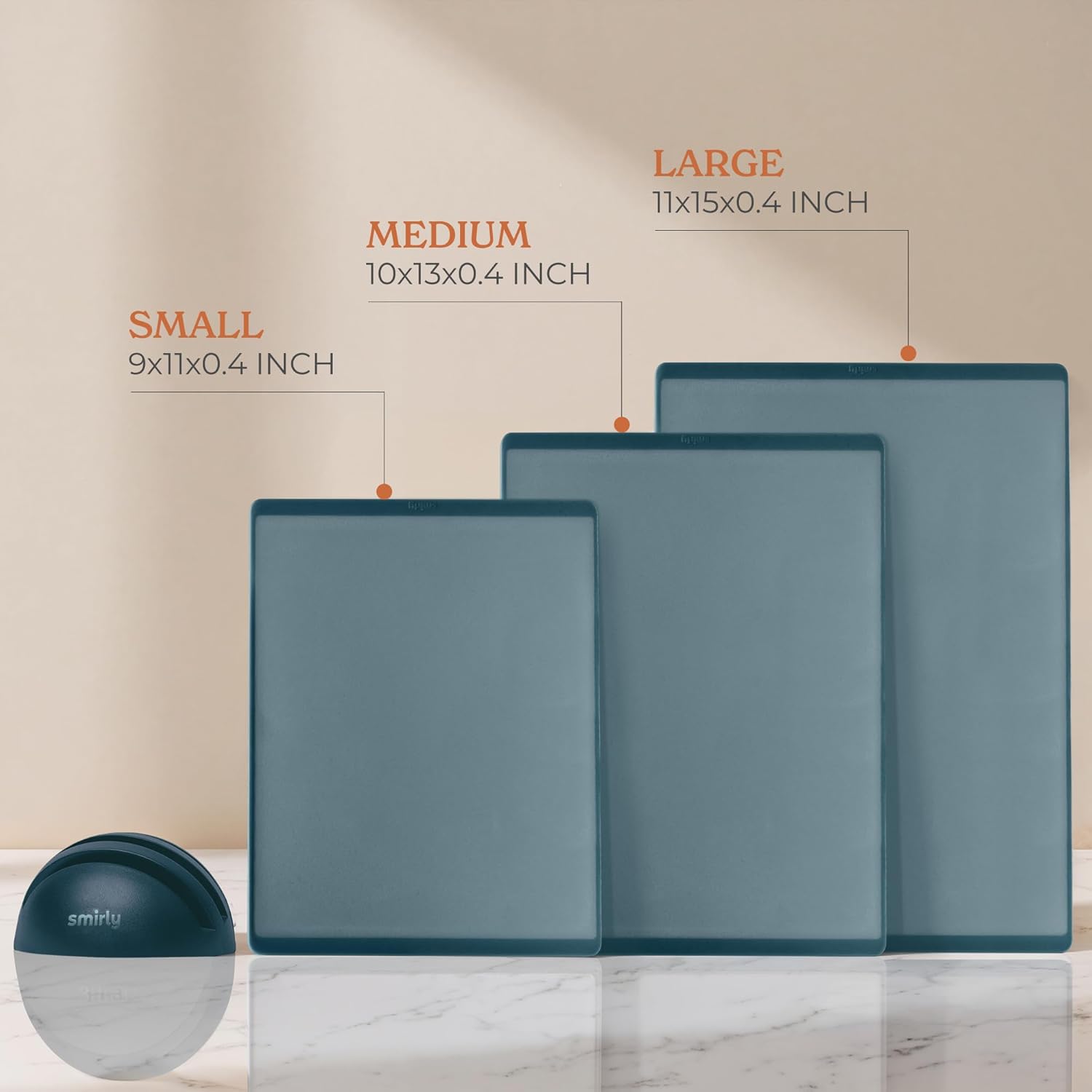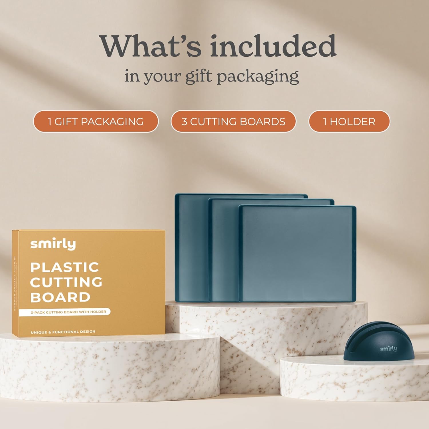 - 3-Pack with Holder: This cutting board set includes small, medium, and large cutting board sizes for every prep need. It also comes with a compact holder that neatly organizes all boards vertically, keeping your countertops clutter-free while ready for any chopping task.