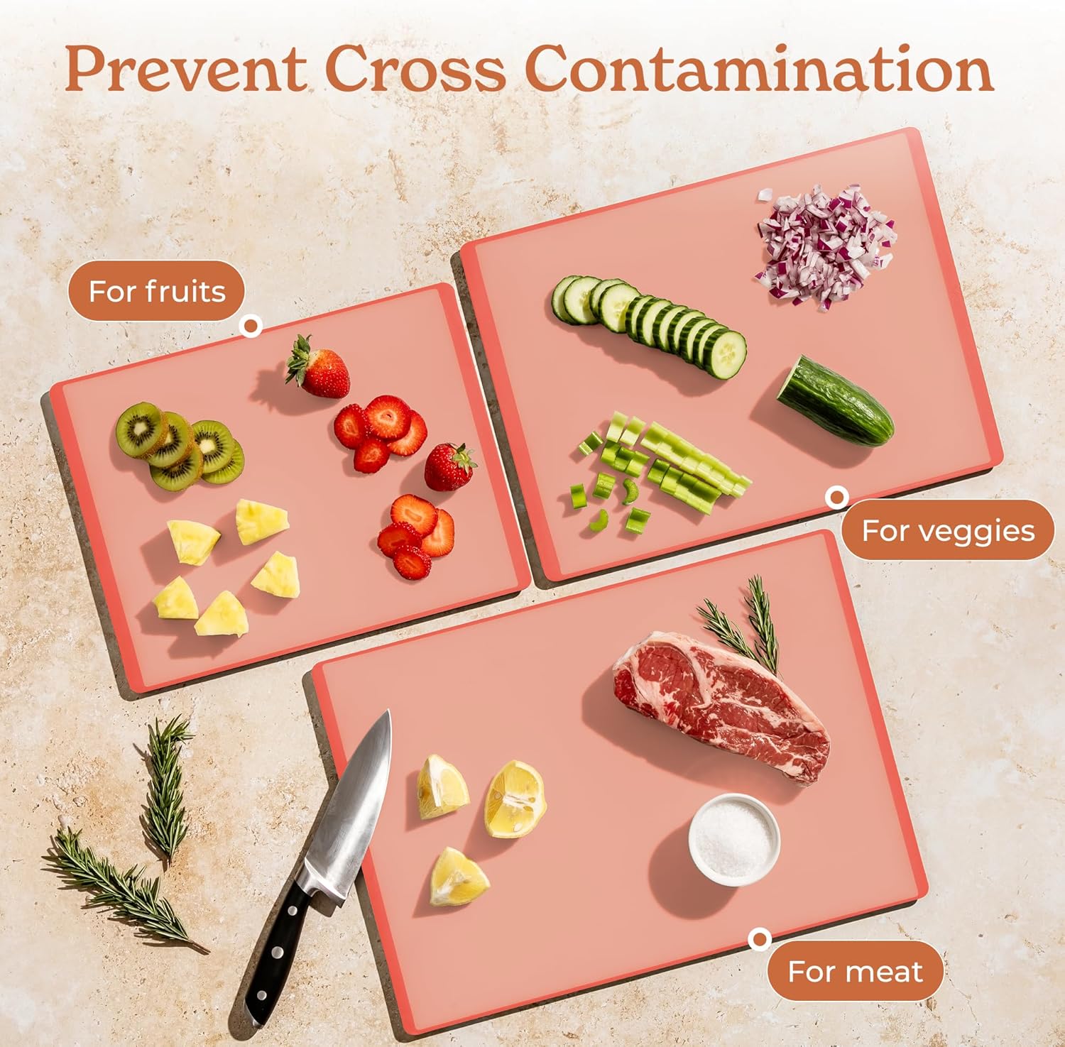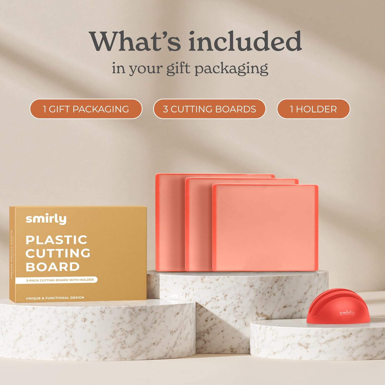 - 3-Pack with Holder: This cutting board set includes small, medium, and large cutting board sizes for every prep need. It also comes with a compact holder that neatly organizes all boards vertically, keeping your countertops clutter-free while ready for any chopping task.