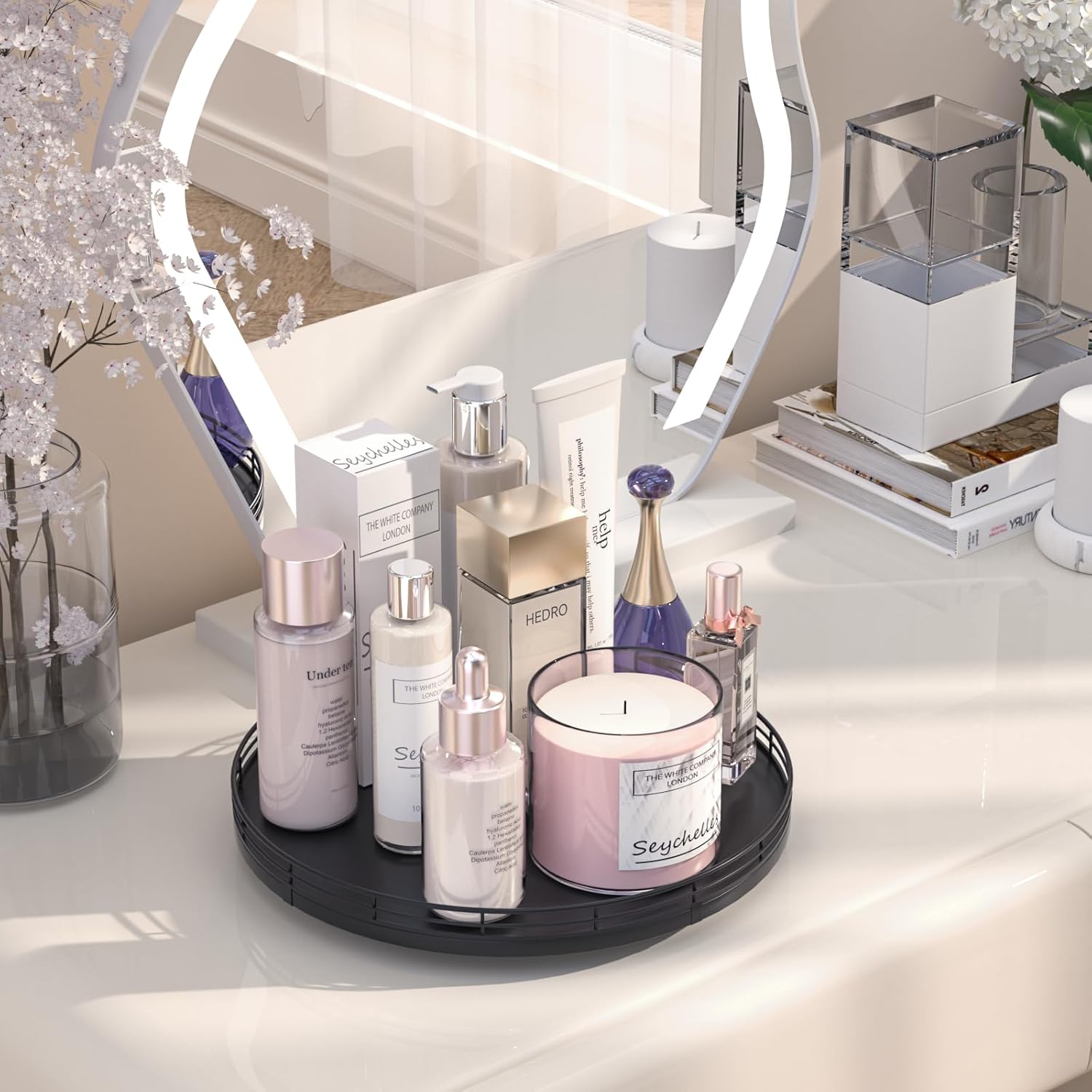 - ๐ง๐ต๐ผ๐๐ด๐ต๐๐ณ๐๐น ๐๐ฒ๐๐ถ๐ด๐ป: The turntable tray features a smooth and silent 360ยฐrotation; Bottom slip-resistant pads for stability and protect your countertop from scratches; Raised edges on each organizer tray to keep items from falling out; Easy to use, no installation required