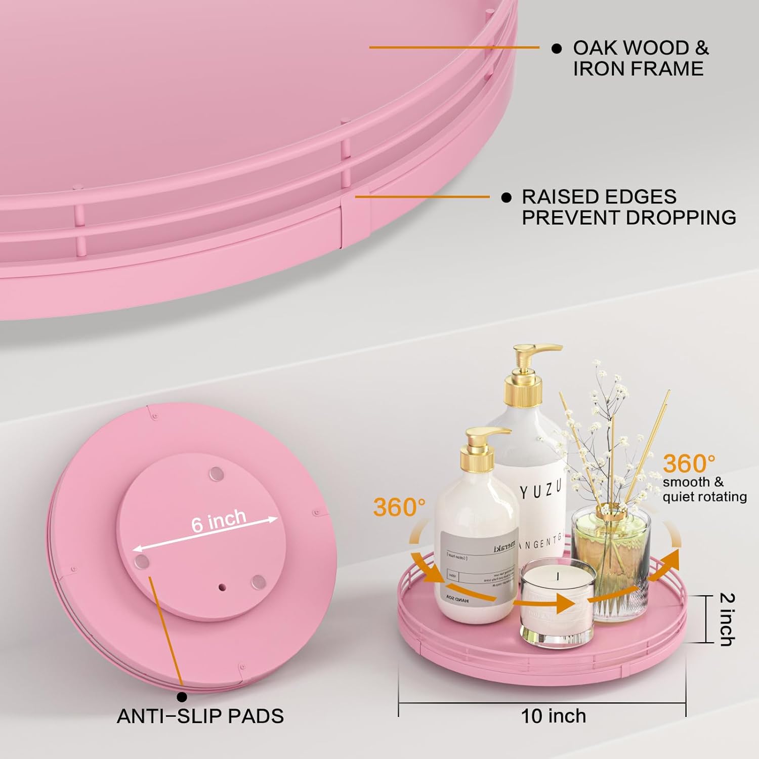 10" Oak Wood Bathroom Tray for Counter, Vanity Tray for Perfume Lotion Candle Makeup Jewelry Sink Soap Holder Turntable Dresser Organizer Countertop Coffee Table Decor Organization and Storage Pink