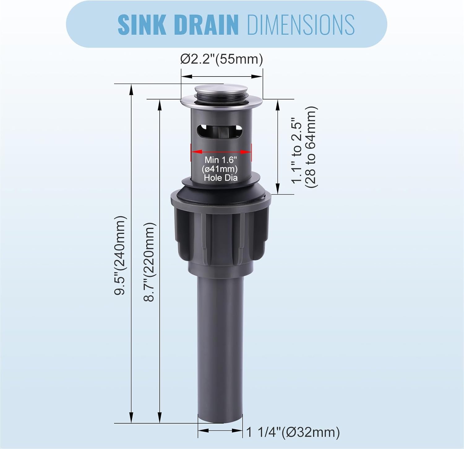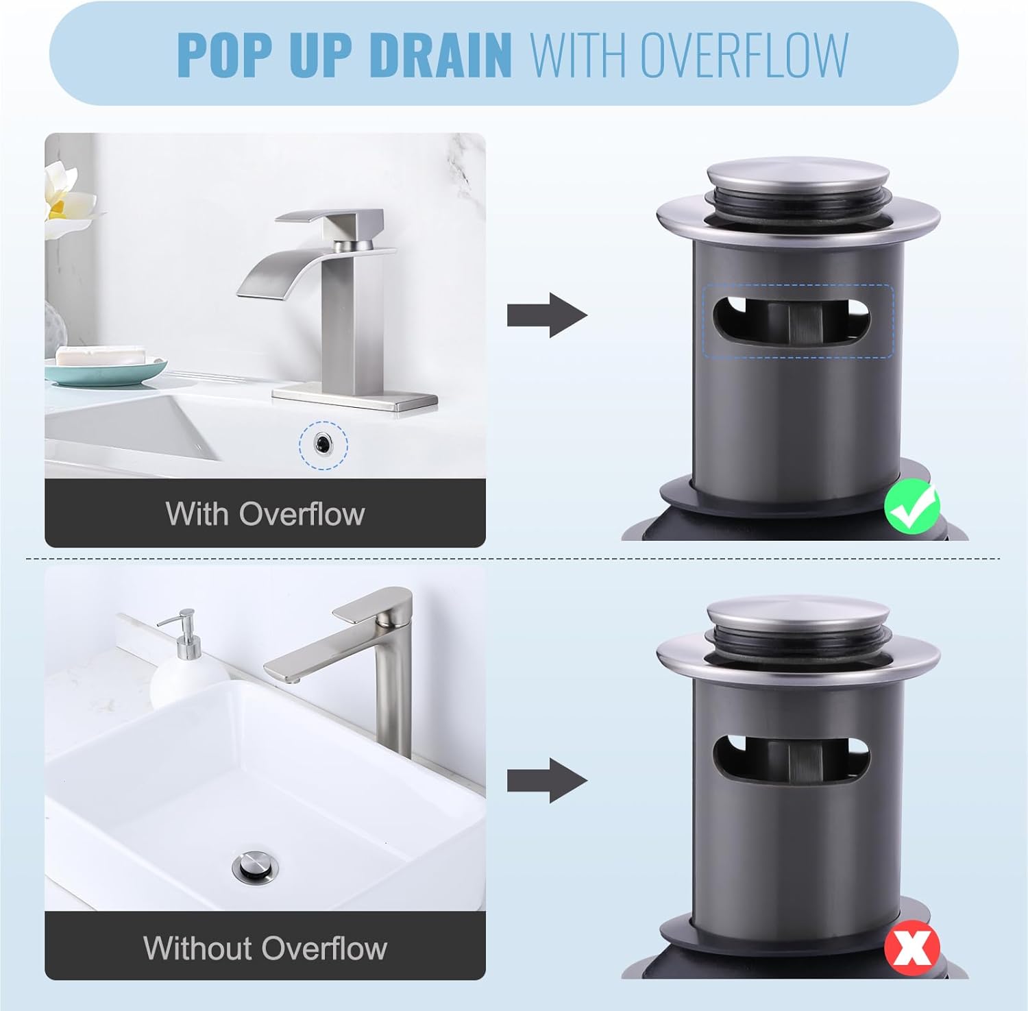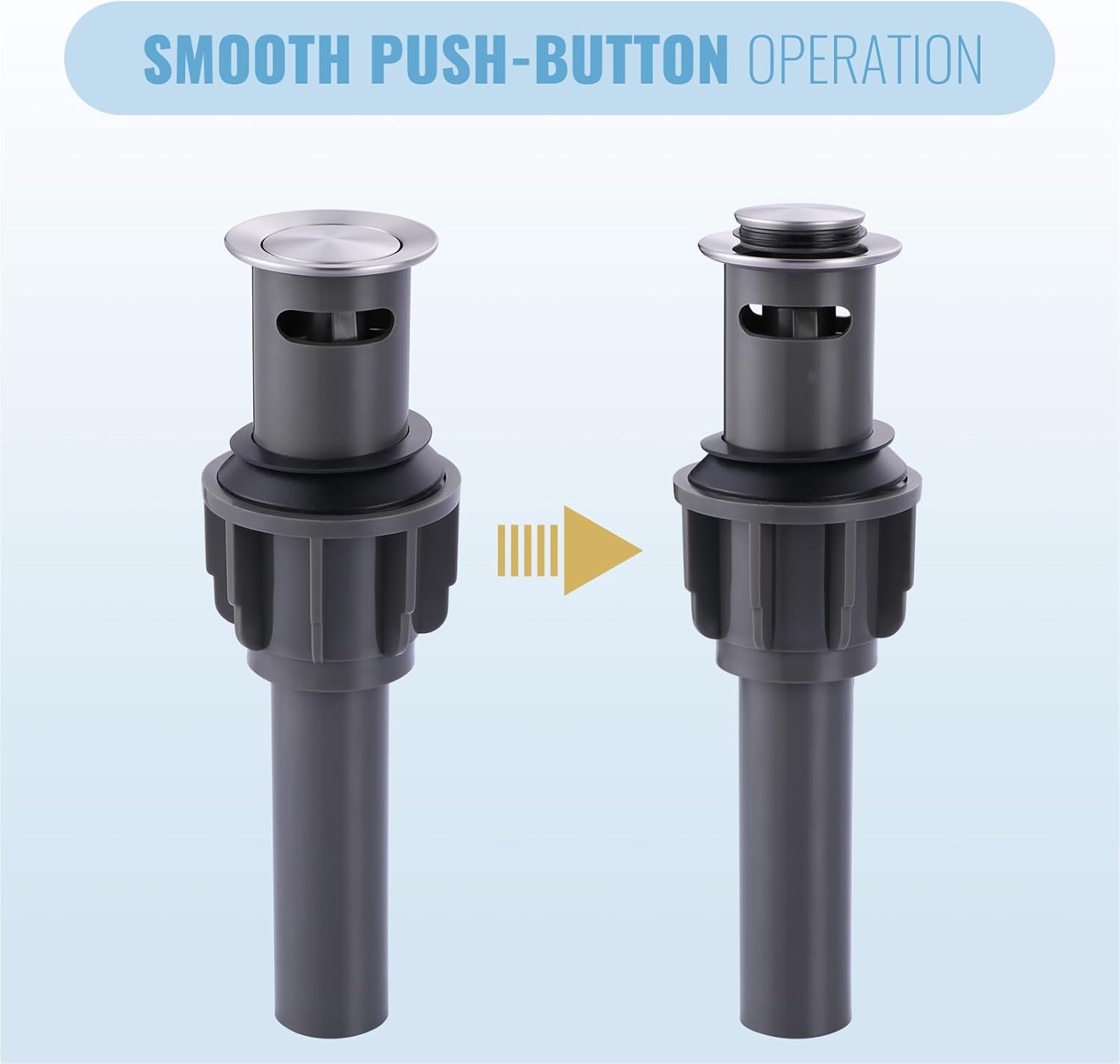 - 【Easy Operation】- Pop up drain stopper simply push the drain down to close and to seal, push again to open and to drain water. The pop up design only needs to press lightly, and the sink drain will quickly sprinkle water.