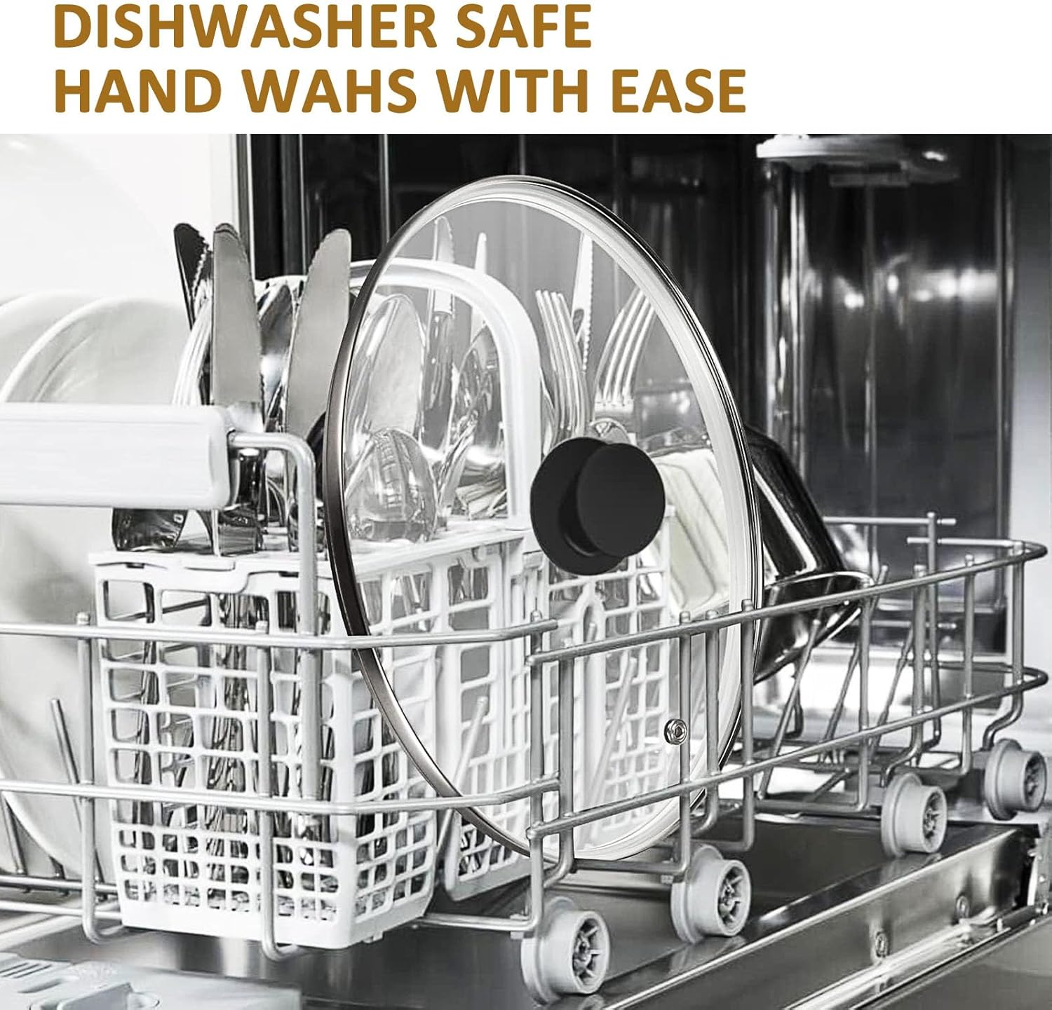 - ✔ TEMPERED GLASS & STAINLESS STEEL RIM – The glass lids are made of tempered glass, sturdy and durable, also easy to check inside foods easily from the transparent glass lid. The edge of the lid is made with stainless steel material, make sure the safe cooking without rust. (Please contact us if any broken during shipping)