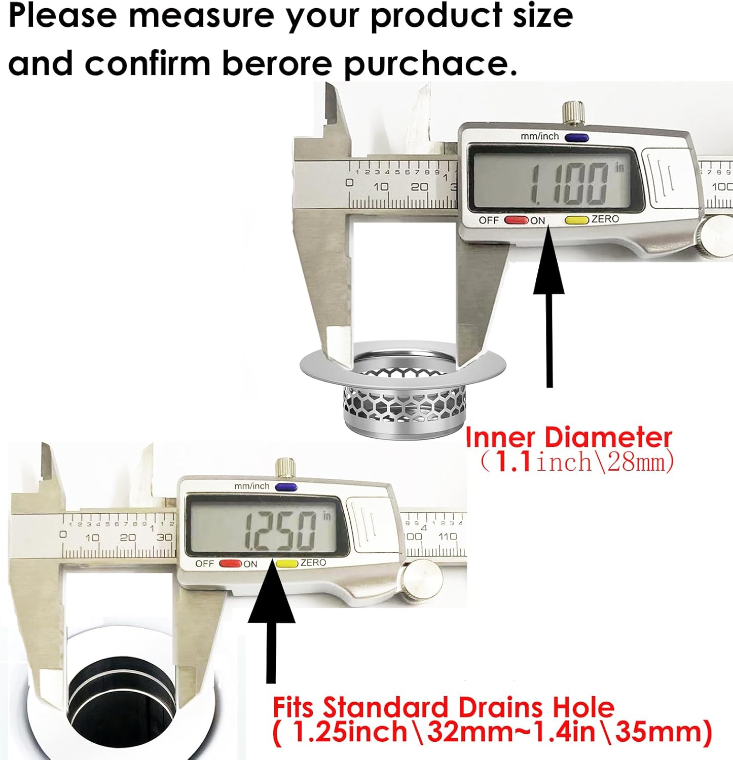 - PERFECT SIZE: Outer Diameter 1.97 inch/50mm, Inner Diameter 1.1inch/28mm, Depth 0.67 inch/17mm. this strainer is great for 1.25" drain. PLEASE CAREFULLY CHECK THE DIAMETER OF YOUR DRAIN SIZE BEFORE YOU PURCHASE.