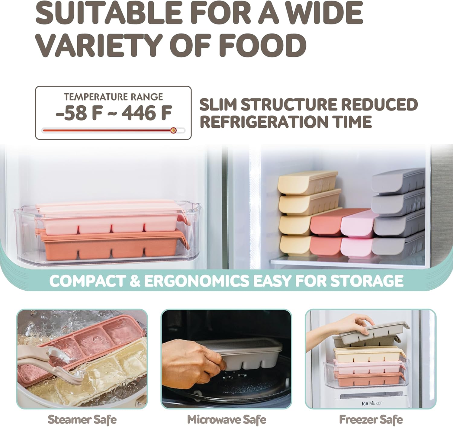 - β Slim and Compact Design: These silicone freezer containers are available in 4, 6 or 12 compartments, featuring a stackable, ultra-slim and ergonomic design for easy storage. The ultra-wide area which receives cold air ensures a faster freezing process of the contents!