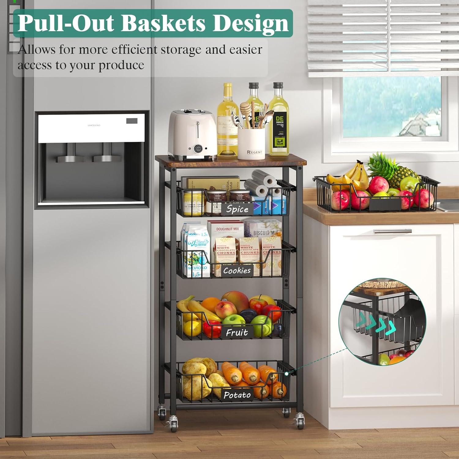 - Each drawer basket is equipped with small pulleys, allowing for easy sliding in and out. This makes it ideal for organizing a variety of fruits, vegetables and snack, including bananas, apples, potatoes, and onions.
