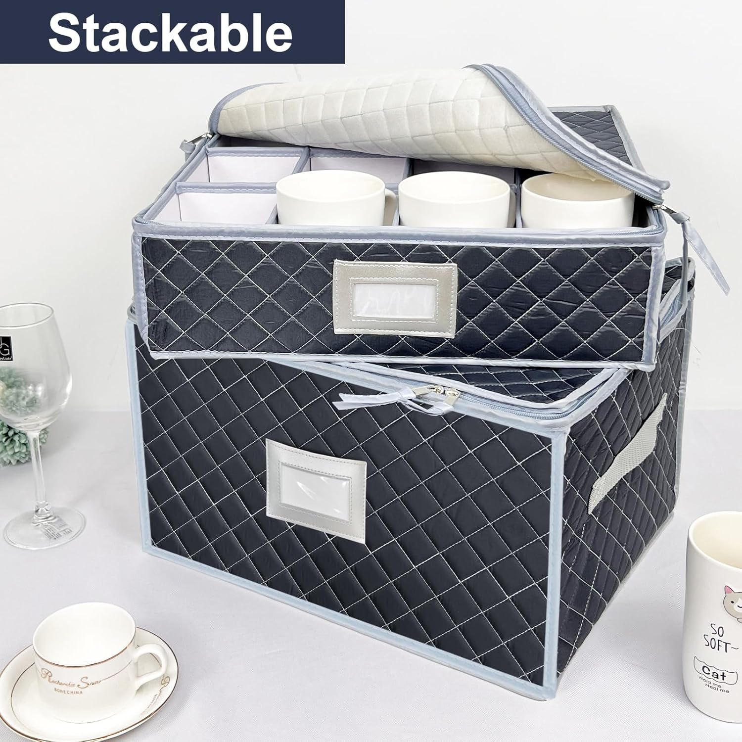- š„ćPremium durable materialć:Stackable wine glass and mug storage Box is made of premium 300D foxford fabric and sturdy thick cardboard,the lid made with thick cardboard inside,the side pieces provide additional protection,so it's more sturdy than others.