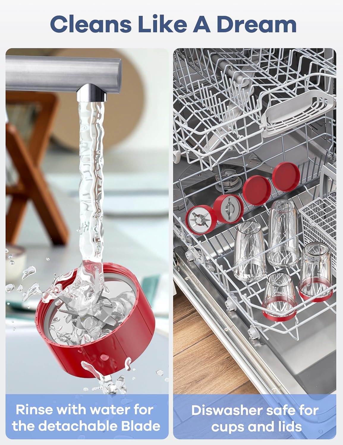 - 【Cleaning Friendly】Cleaning is a breeze – just add soap and warm water, and the blender will start its self after properly locked into the base. In addition, the smoothie maker can be easily cleaned in a dishwasher, except for the motor part (The Main Body).