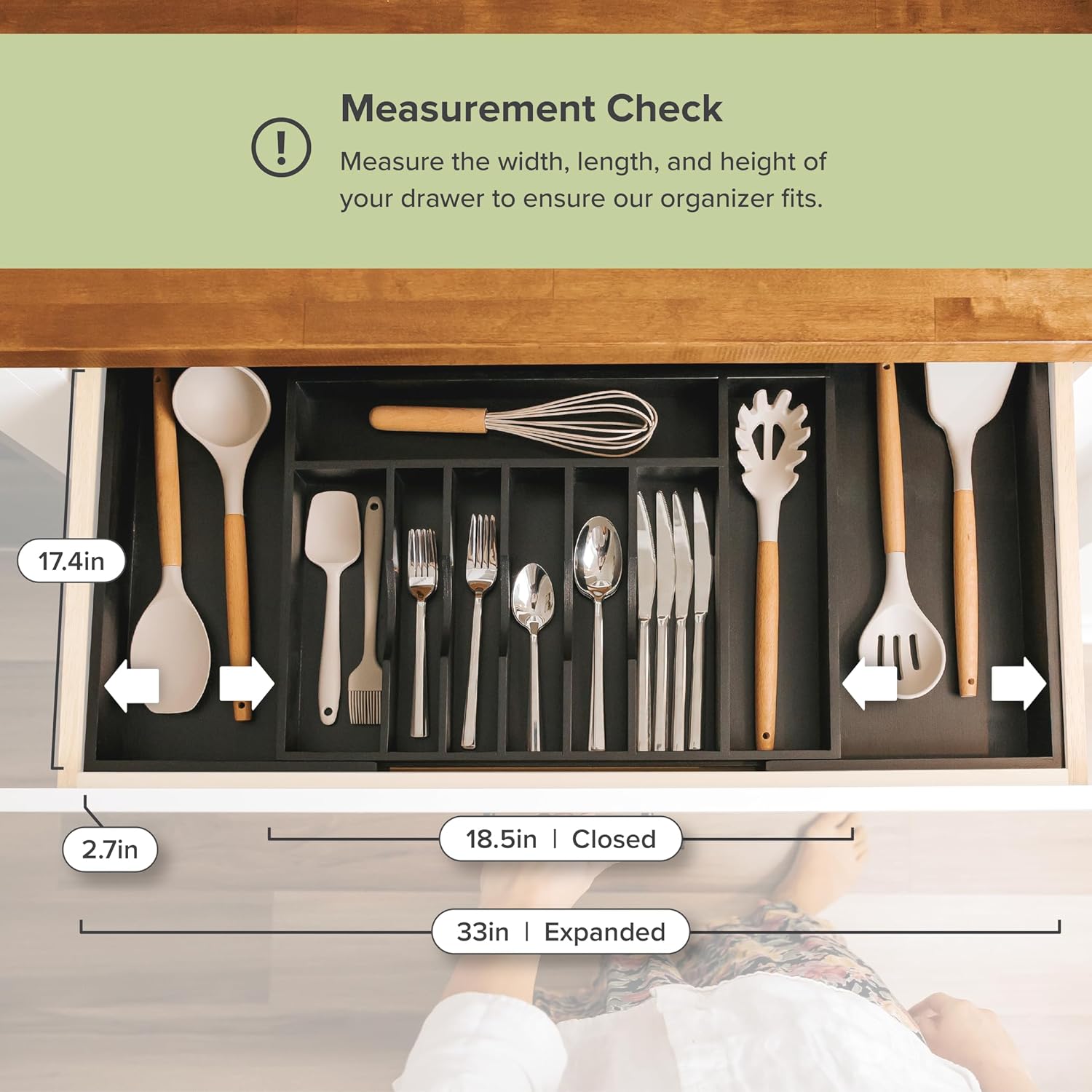Premium Silverware, Flatware and Utensil Organizer for Kitchen Drawers, Food-Safe Contract Grade, Expandable from 18 to 33 In, Black Bamboo