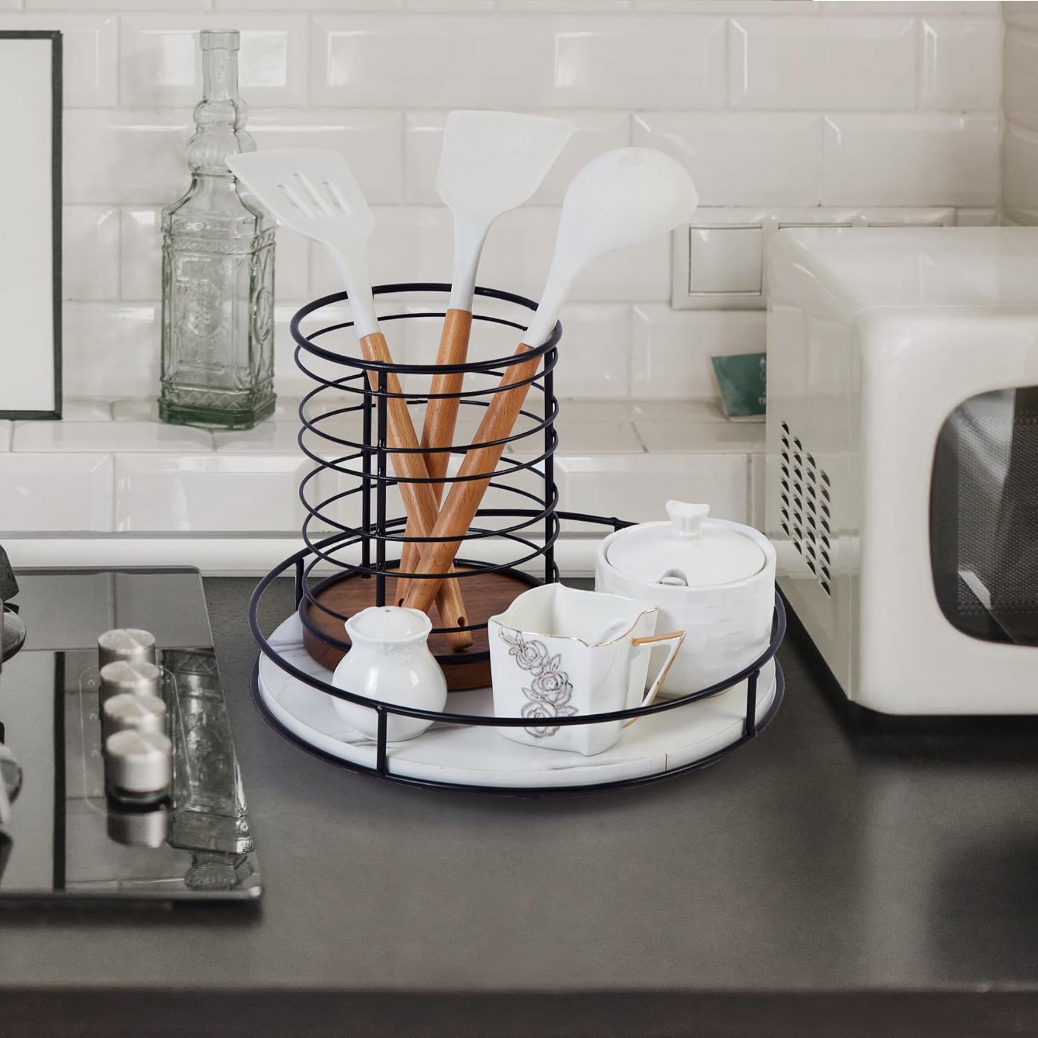 12 Inch White Wood Lazy Susan Turntable for Table, Kitchen Rustic Brown Turntable Organizer with Steel Frame, 360 Degree Decorative Lazy Susan for Countertop Cabinet or Centerpieces