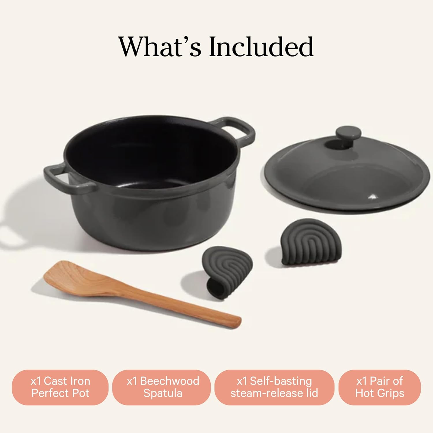 Our Place Cast Iron Perfect Pot | 6-in-1 Multifunctional 5.5 Qt. Toxin-Free Enameled Dutch Oven with Self-Basting Lid | Hot Grips & Beechwood Scraper | Induction Cooktop and Oven Safe | Char