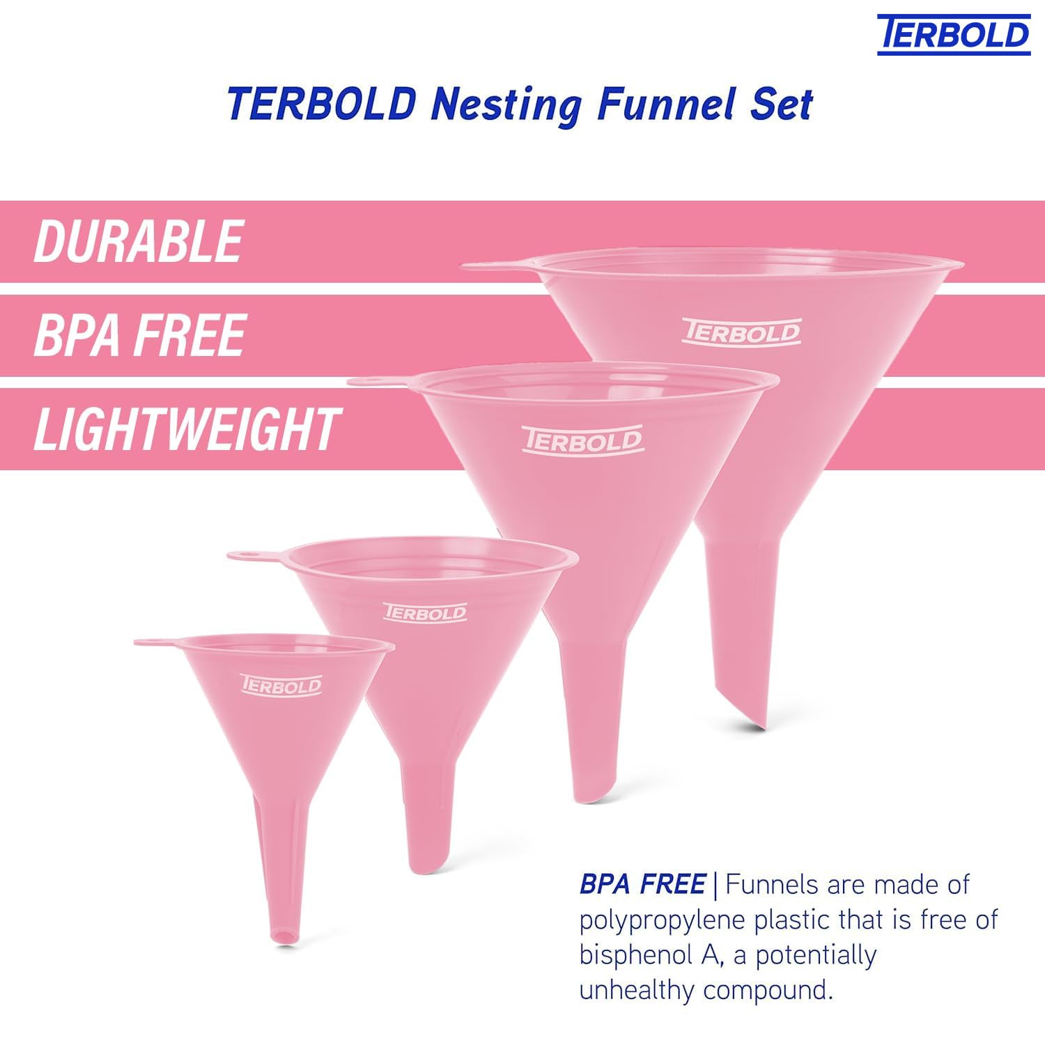 4pc Funnel Nesting Set in BPA Free Plastic for Kitchen Cooking, Car Oil, Home, or Lab Use (Pink)